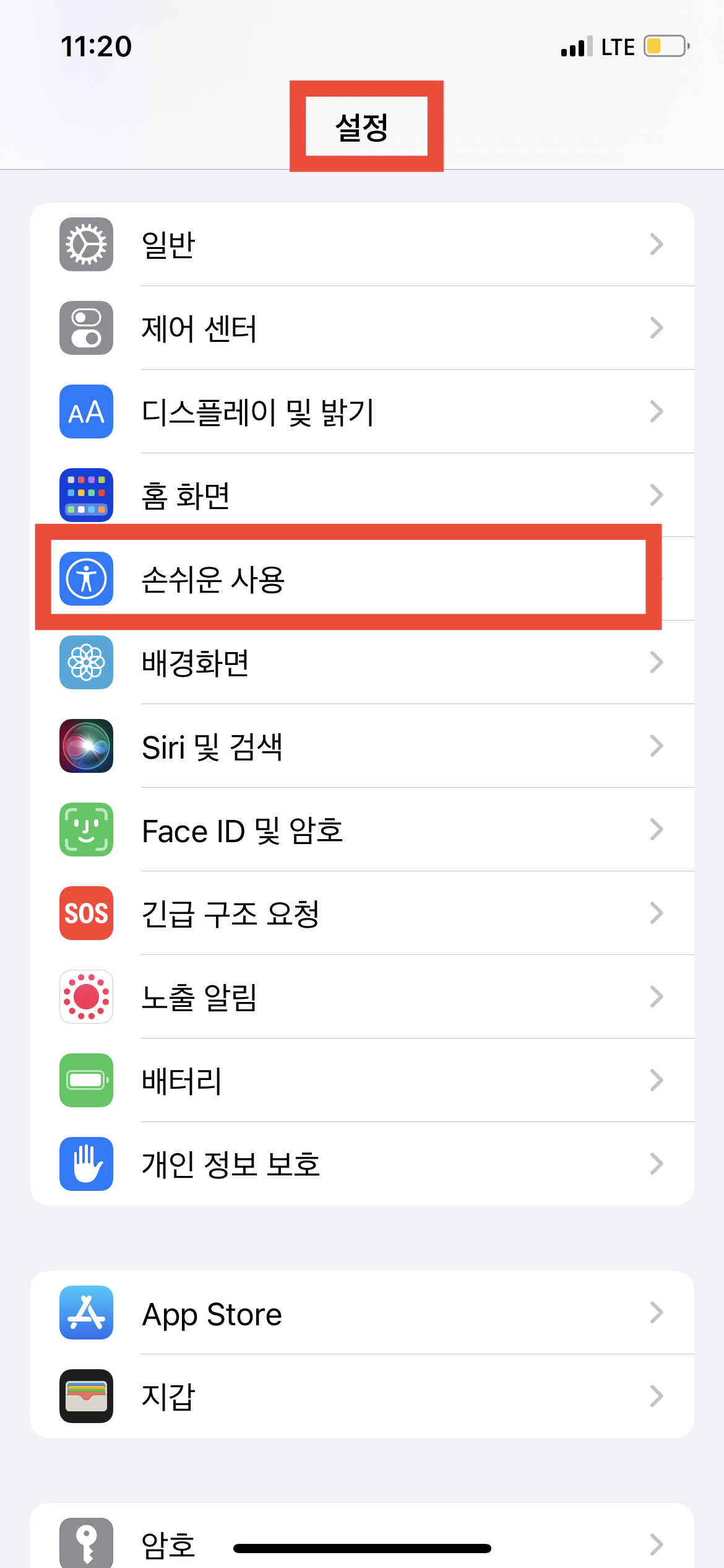 아이폰에서 '설정' 아이콘을 클릭하면 위와 같은 화면이 나오게 된다. 그러면 여러 가지 메뉴들이 보이는데 그중에 우리는 쉽게 화면 캡처를 할 거니까 '손쉬운 사용'을 터치해준다. 손쉬운 사용에는 우리가 사용할 기능 말고도 아이폰 자체적으로 IOS와 아이폰 사용자들을 위한 편리한 기능들이 많이 들어가 있다.