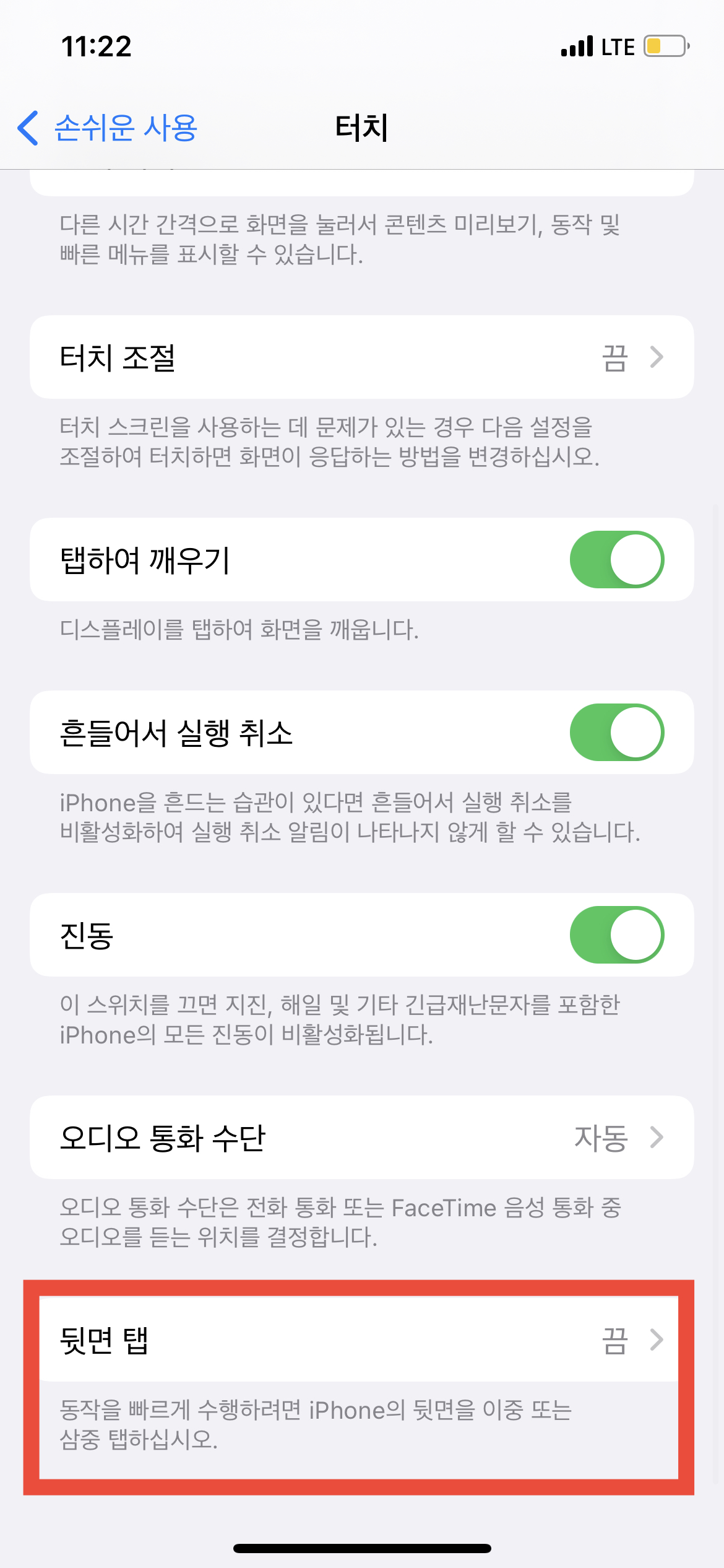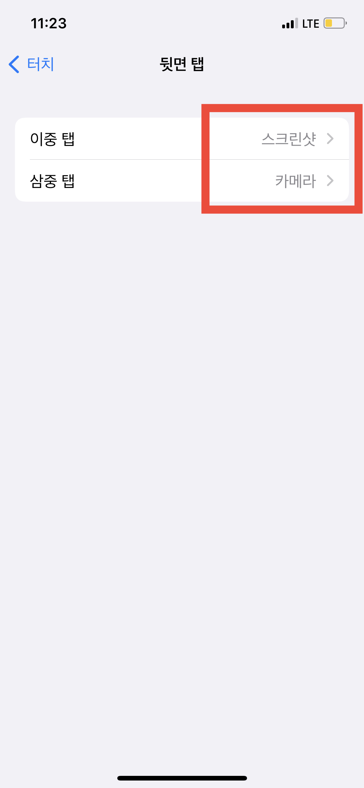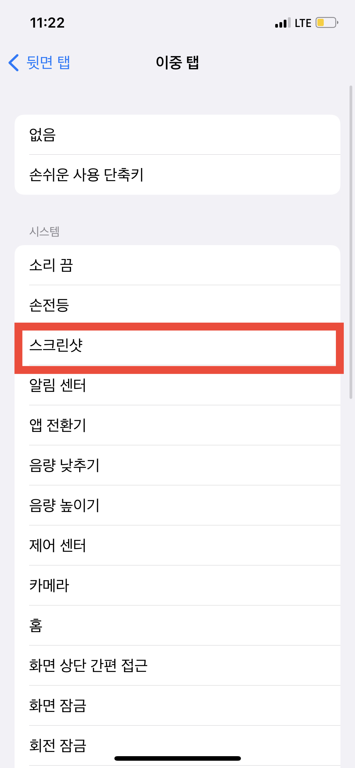 '터치'에 들어왔다면 가장 아래쪽에 보이는 <뒷면 탭>이 현재는 '끔'상태로 되어있는 것을 확인할 수 있을 것이다. 이 기능을 활성화시켜주어야만 '손가락 1개'로 화면 캡처를 할 수 있으니 누르고 보이는 메뉴가 2개 있을 것이다. <이중 탭>과 <삼중 탭>이 보일 텐데 개인의 취향에 따라서 선택할 수 있다. 나는 개인적으로 <이중 탭>을 화면 캡처 명령어로 사용하고 싶어서 <이중 탭>에 들어와서 여러 항목 중에서 '스크린숏'을 선택했다.