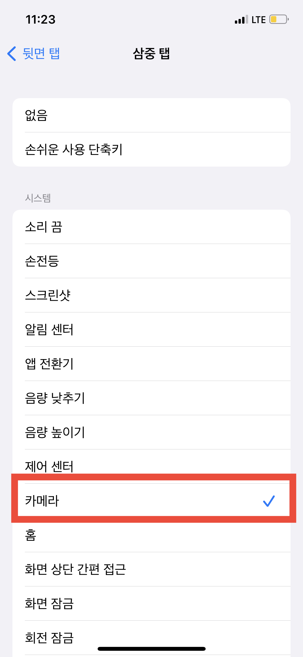 사실 나는 스크린숏만 할 생각이었는데, 나름 재미있고 신박한 기능인 것 같아서 이번에는 <삼중 탭>에 들어가서 <카메라>를 선택했다. 그래서 내 아이폰 뒷면을 '손가락 1개'로 두 번 탭 하면 스크린샷이 찍히고 세번 탭하면 카메라가 자동으로 켜지도록 설정해보았다.
