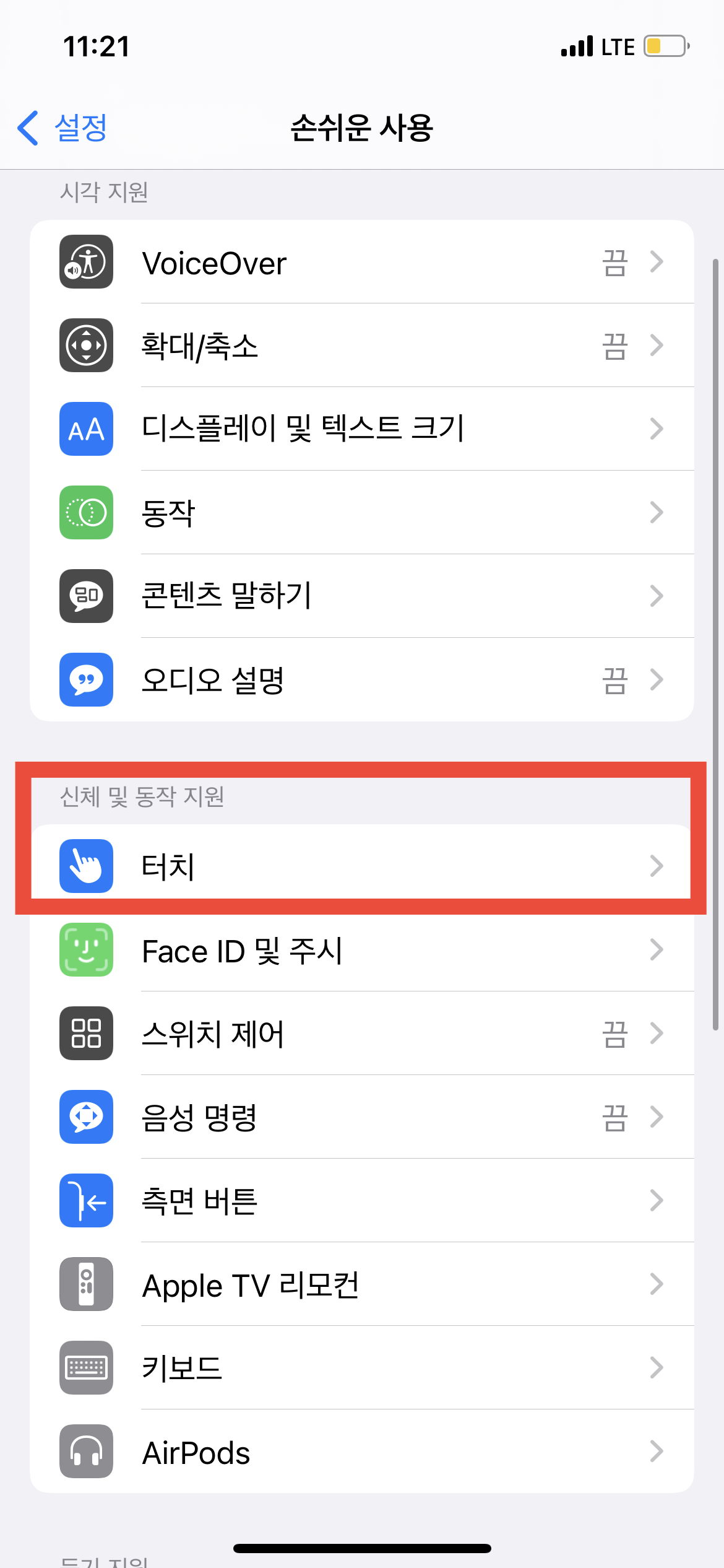 우리는 손가락 하나로 '터치'해서 화면을 캡처하려는 목적이 있기 때문에 여러 메뉴 중에서도 '터치'를 눌러주면 된다. 아이폰을 '터치'하는 것과 관련된 편리하고 쉬운 기능들을 설정할 수 있는 다양한 메뉴가 나온다.