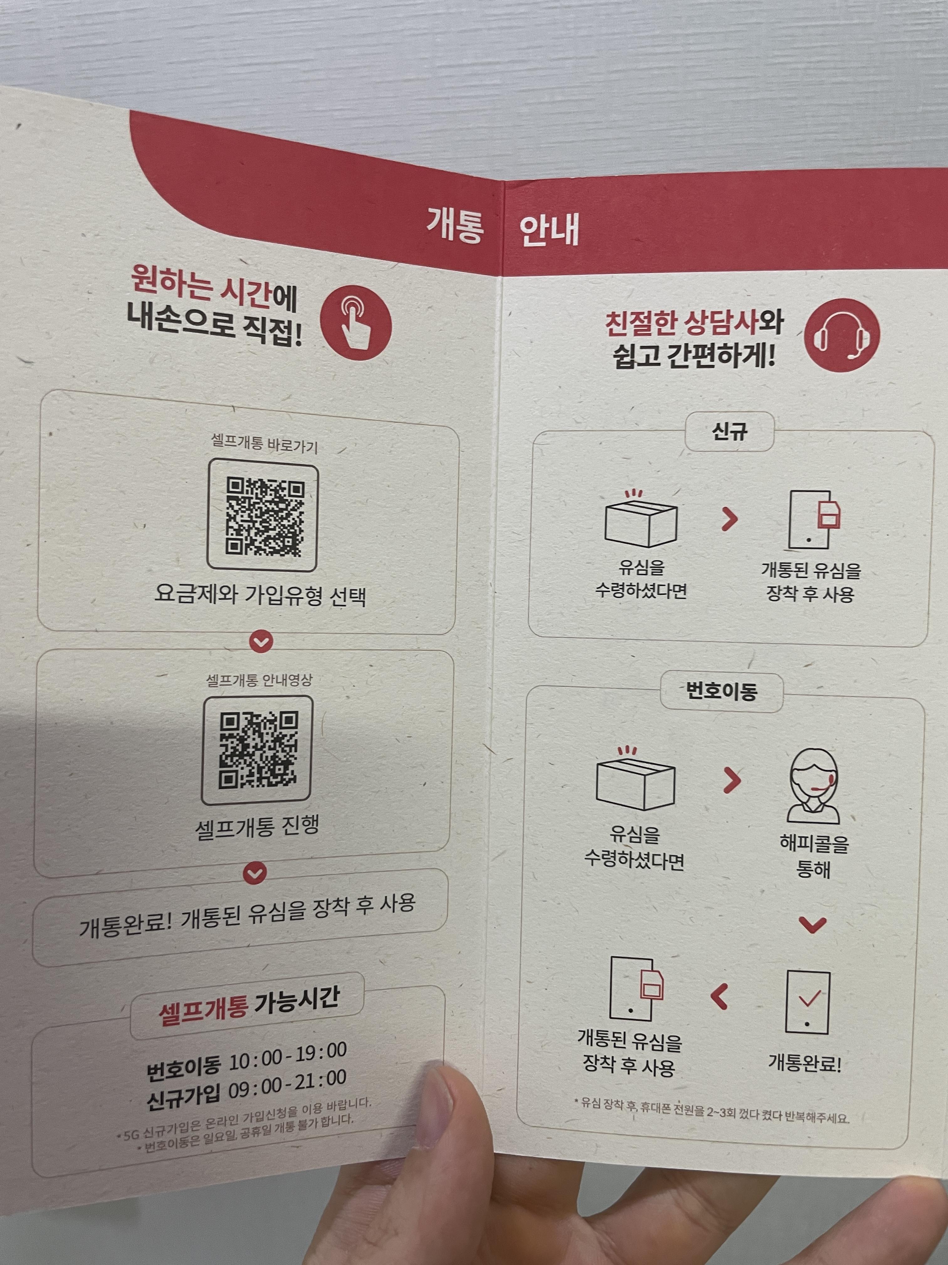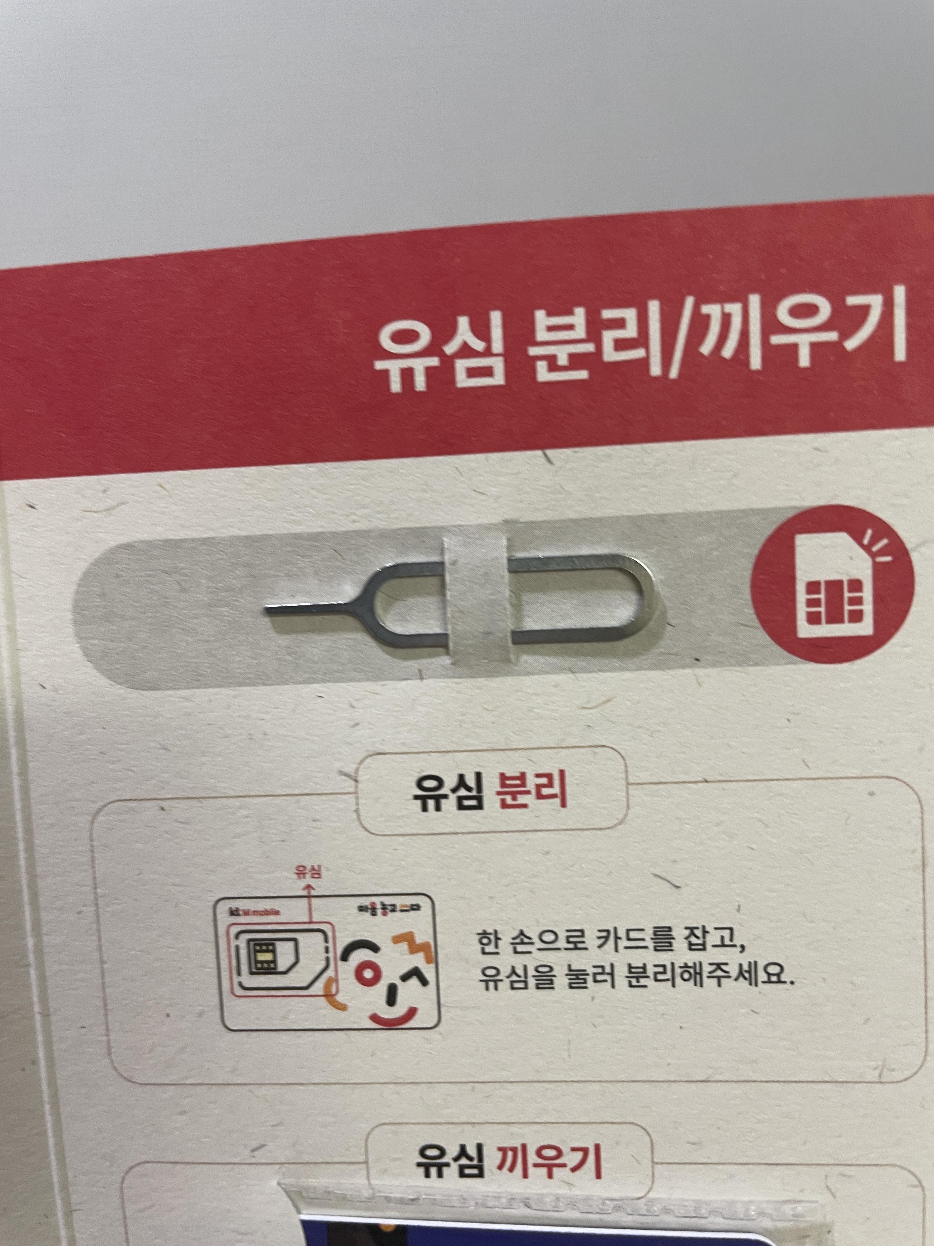 유심을 받으면 안에 개통을 하는 방법과 더불어 유심칩이 들어있는 카드 + 아이폰 전용 유심 분리용 도구가 들어있다. 일단 개통해야 하니까 설명서를 잘 읽어보자.