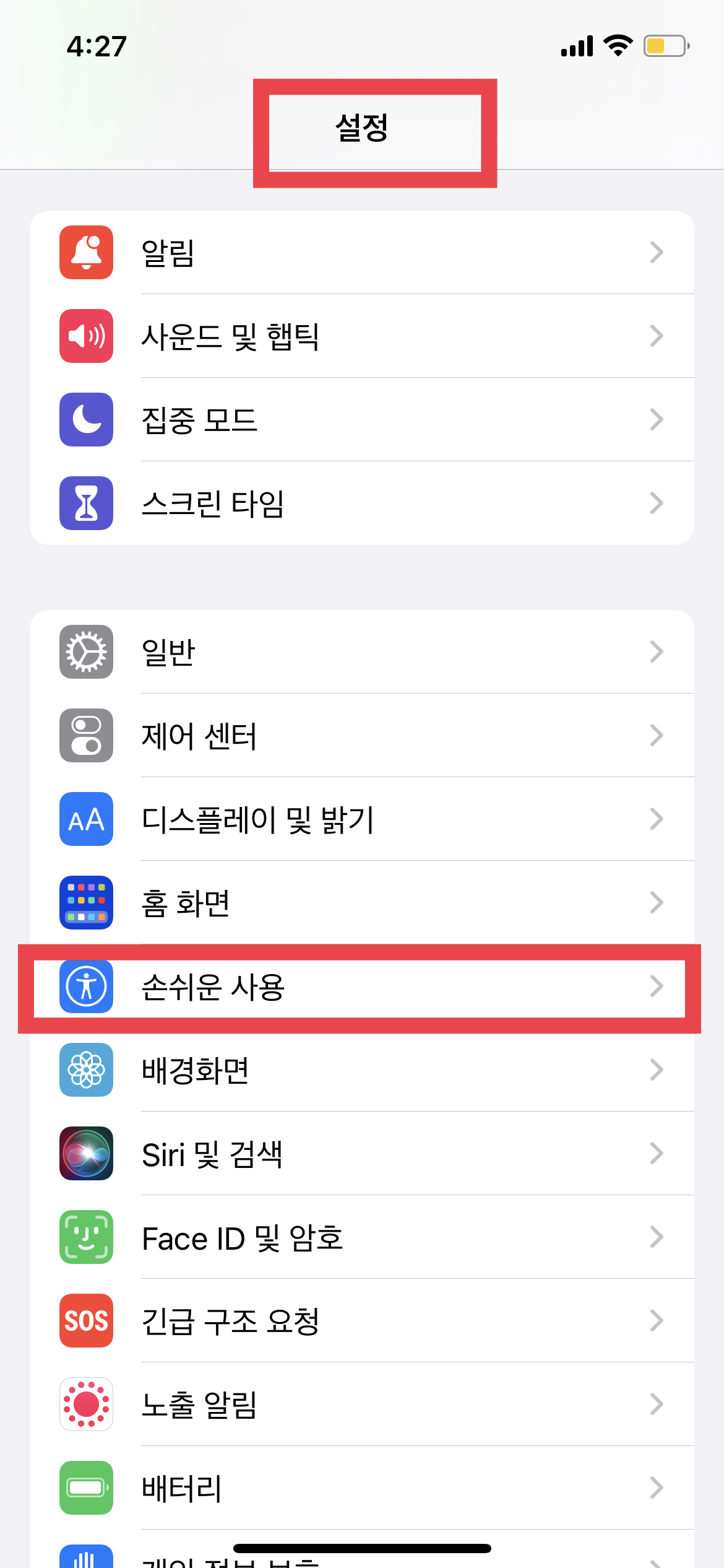 우리는 여러 가지 아이폰 설정을 할 수 있는 메뉴 중에서 '손쉬운 사용'을 터치해준다.