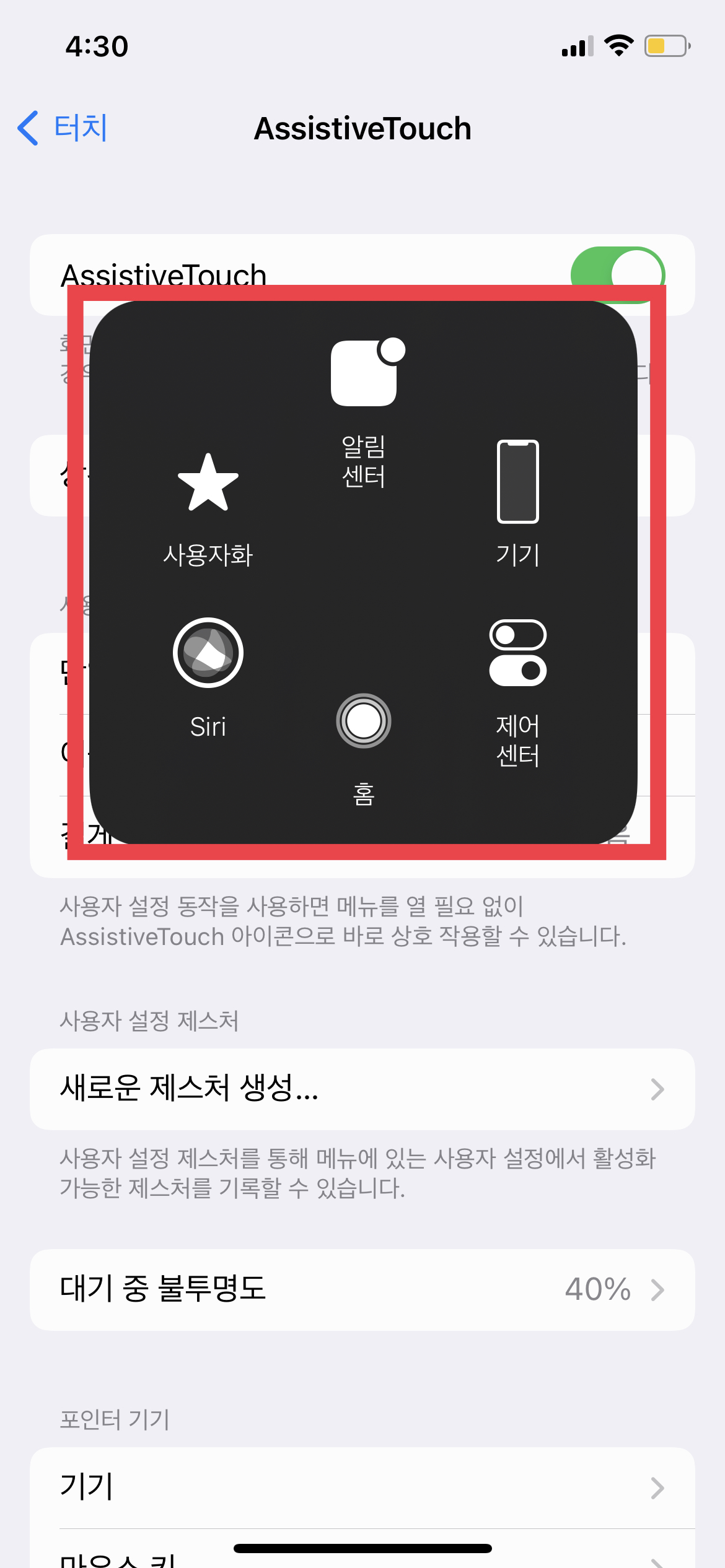 맨 위의 해당 토글을 활성화하면 사진에는 보이지 않지만 본인의 아이폰 액정을 보면 오른쪽 아랫부분에 '동그란 아이콘'이 생겼을 것이다. (스크린숏에는 찍히지 않음)이 아이콘으로 홈버튼으로 가는 것 이외에도 다양한 기능을 수행할 수 있다.