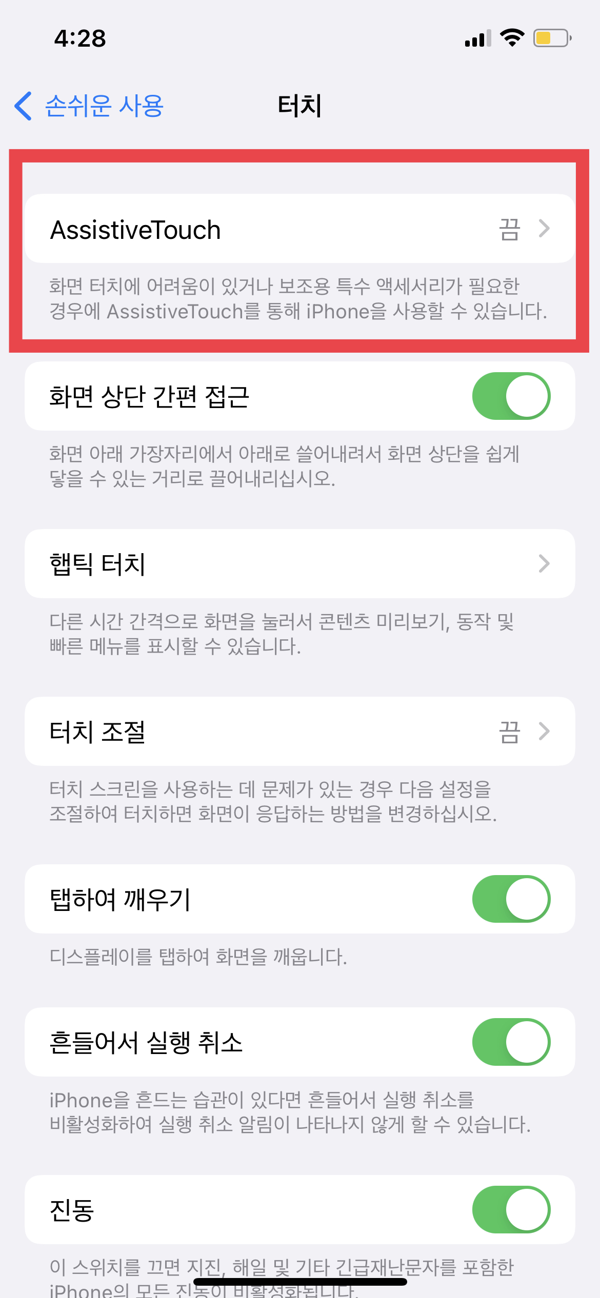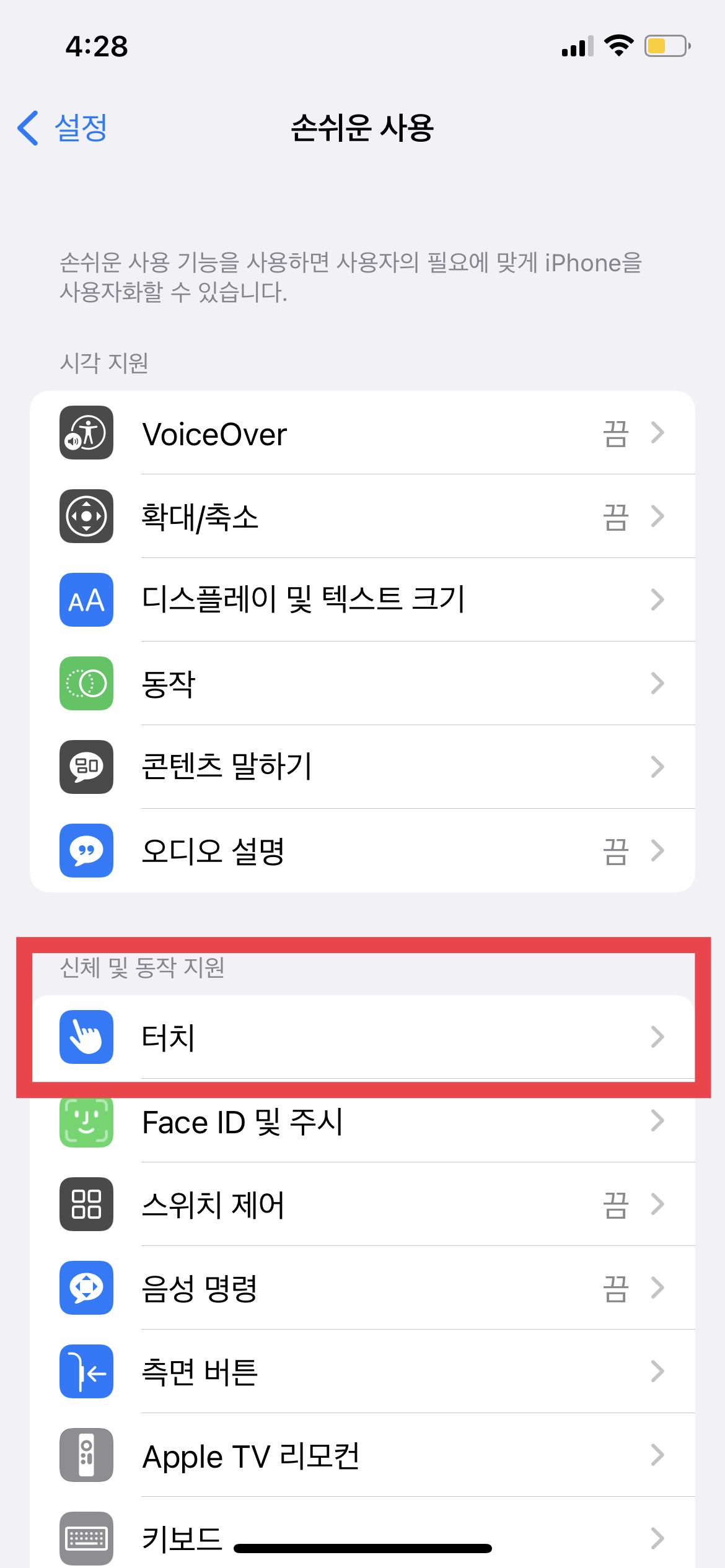 손쉬운 사용을 누르고 나면 '터치'를 놀러 준다.