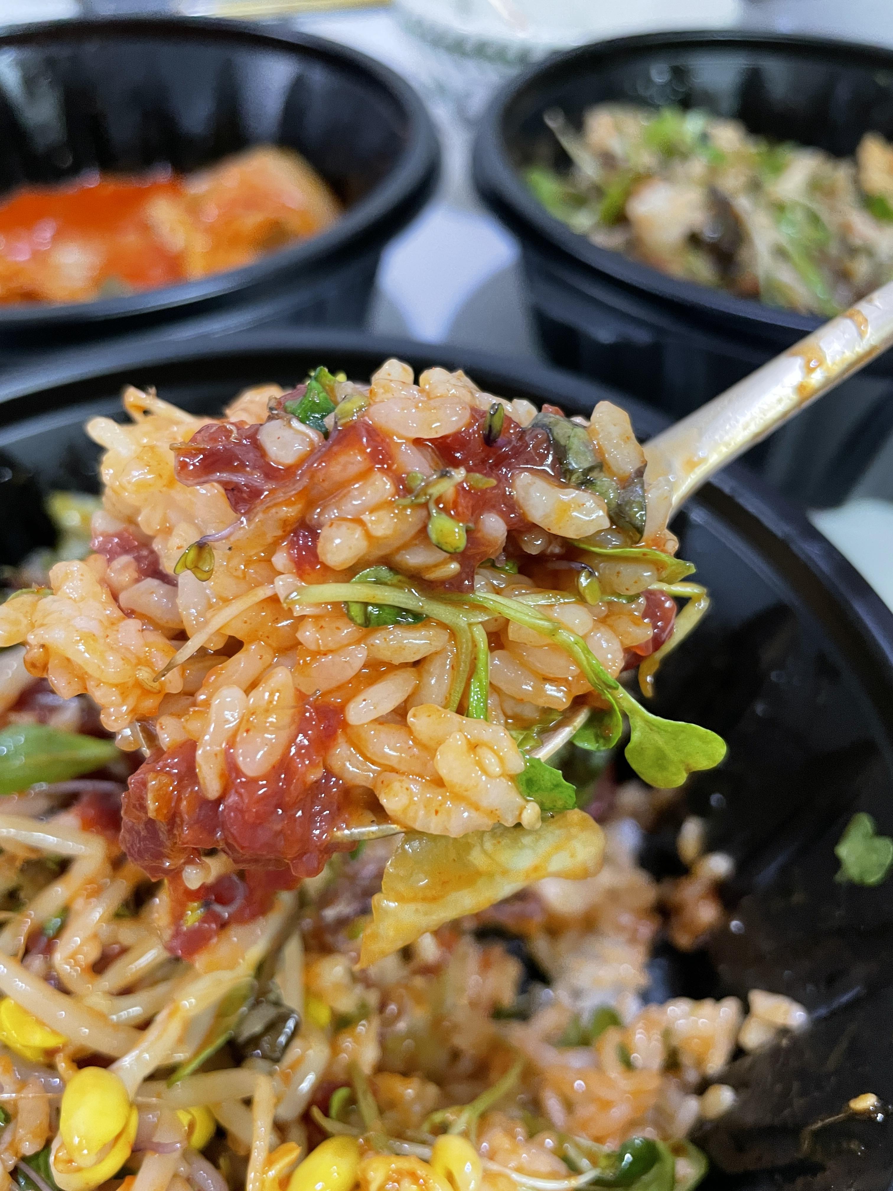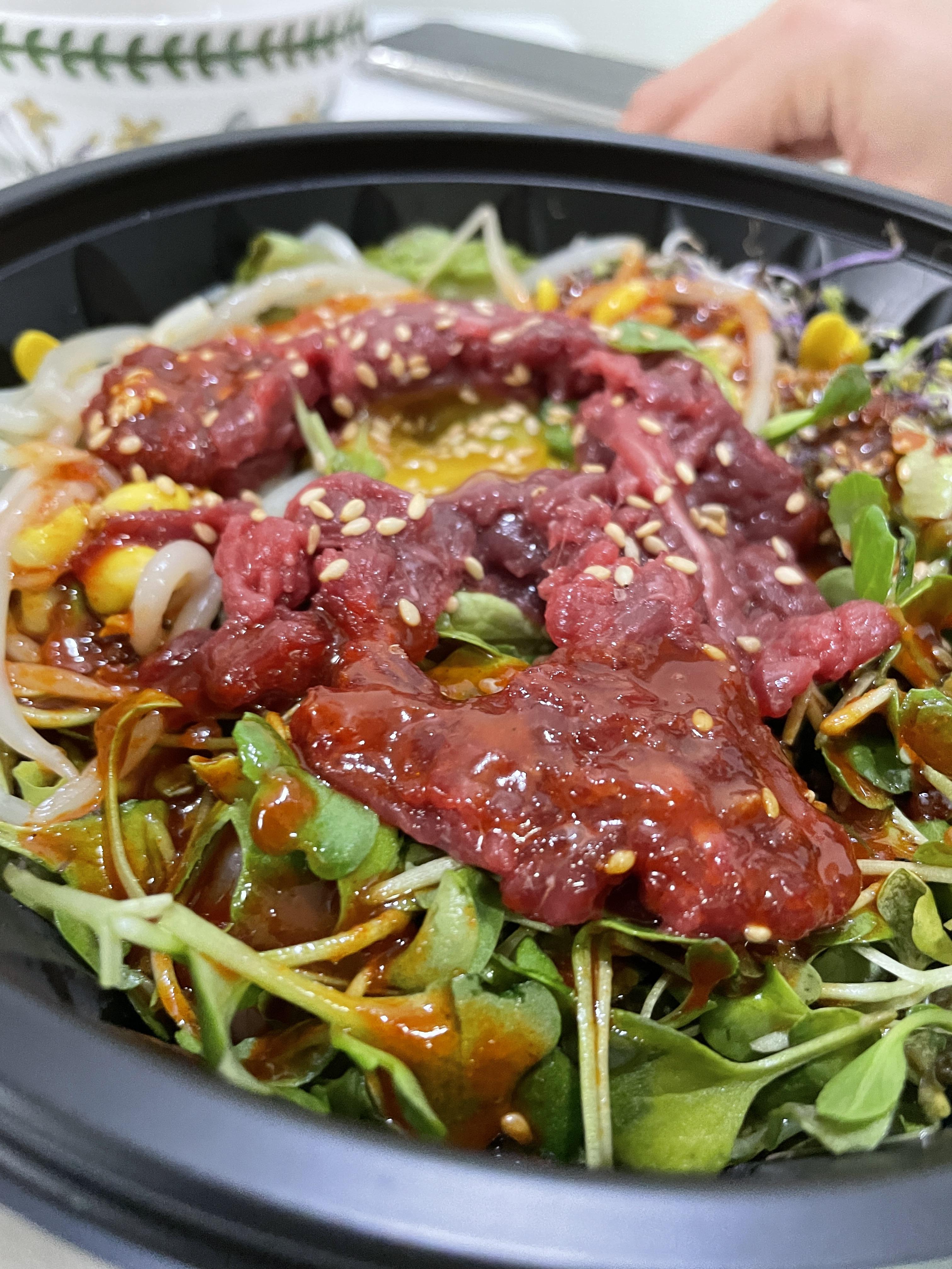 육회비빔밥은 뚜껑을 따자마자 바로 '와!'소리가 나왔다. 밥 위에 잔뜩 올라간 육회'덩어리'를 보면 모두가 나와 같은 반응을 보일 것이다. 게다가 계란 노른자도 들어가 있고, 참기름도 적당히 뿌려져 있어서 비벼서 먹기만 하면 완성형 육회비빔밥이었다.
