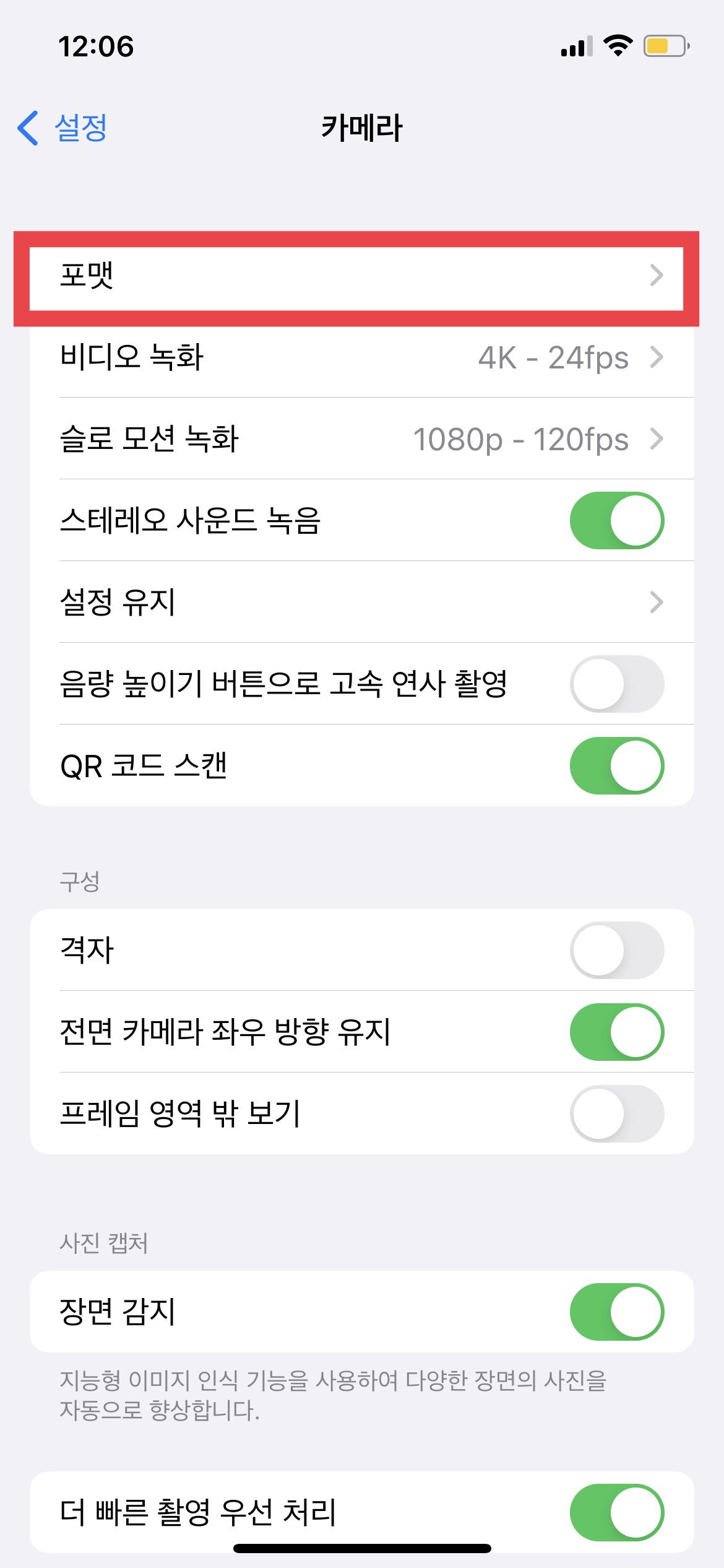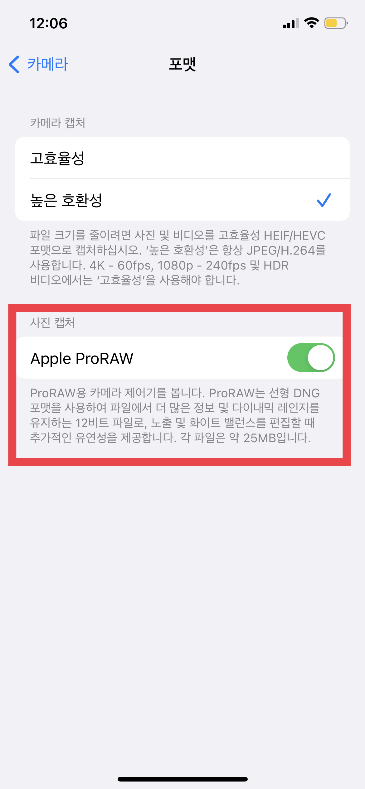 그럼 전문가들이 사용하는 DSLR을 이용해 찍은 사진에 뒤처지지 않기 위해서는 반드시 우리도 RAW 설정을 켜주어야 한다. 포맷에 들어가면 Apple proRAW 설정을 켜고 끌 수 있는데, 이 설정을 켜면 사진의 노출이나 화이트 밸런스의 수정에 지대한 영향을 미치기 때문에 대부분 사진 전문가들이 사용하는 옵션이다.
