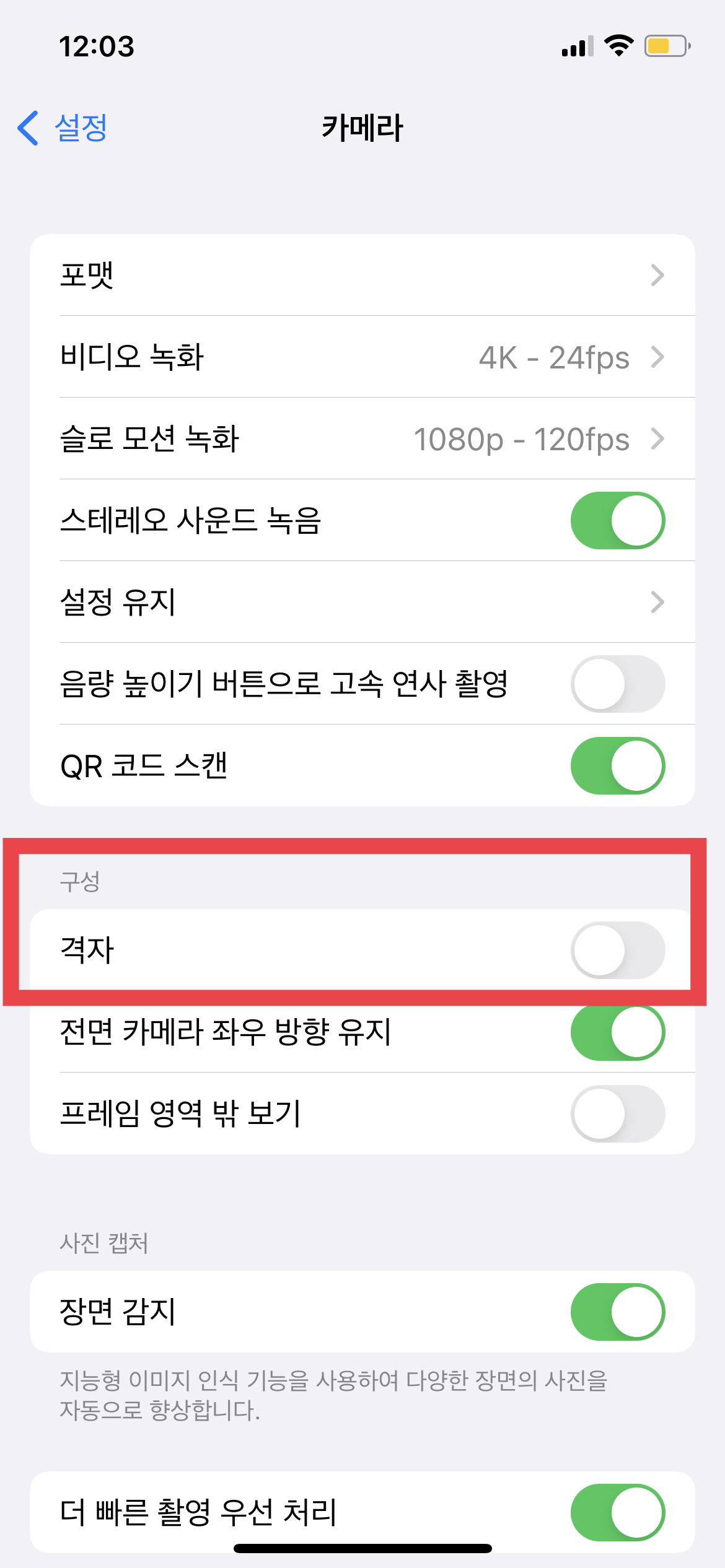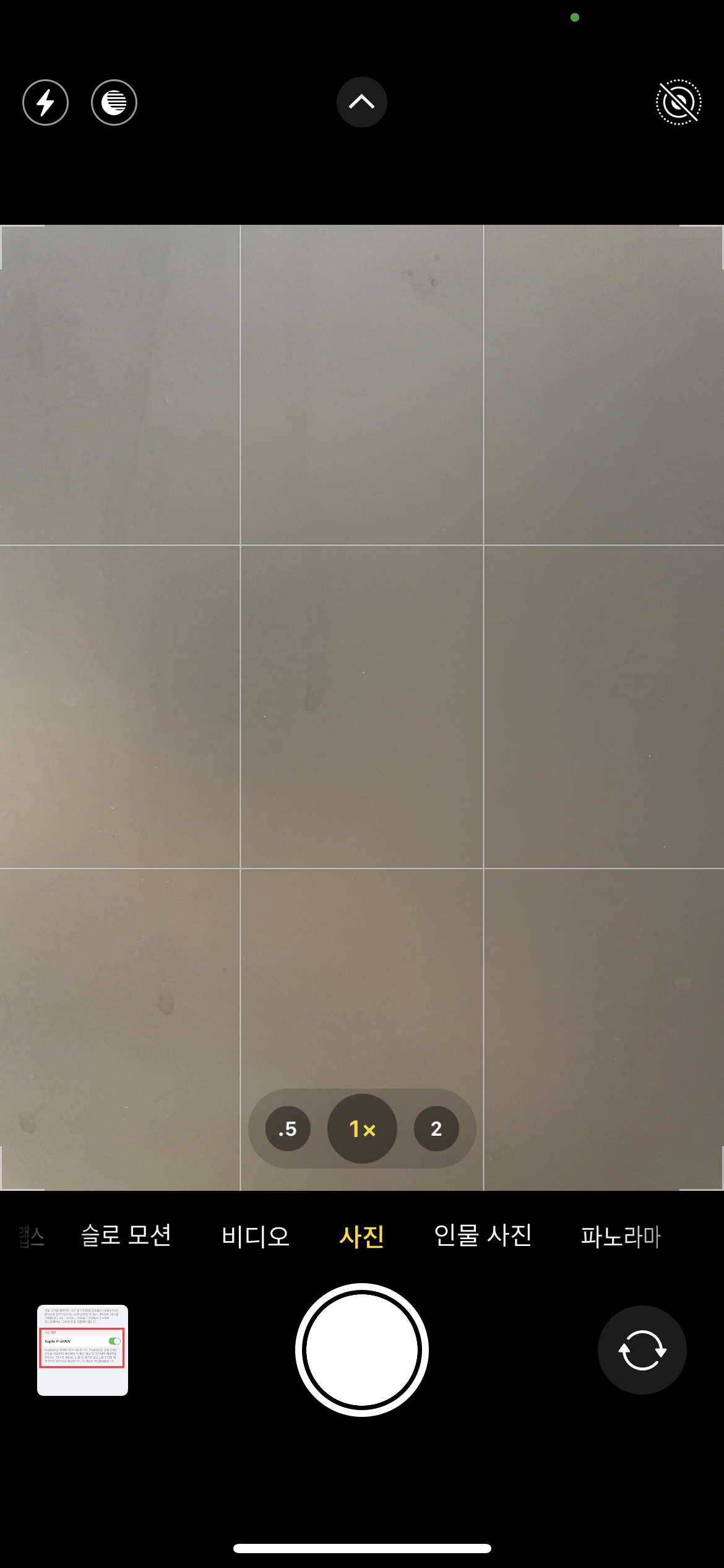 격자를 활성화시키면 사진 안에서 피사체의 위치를 조금 더 정확하게 잡는데 도움을 줄 수 있다. 나도 격자를 활성화하고 확실히 사진의 퀄리티가 높아진 것을 느낄 수 있었다. 오른쪽 사진에서 카메라의 격자가 활성화됐음을 확인할 수 있다.