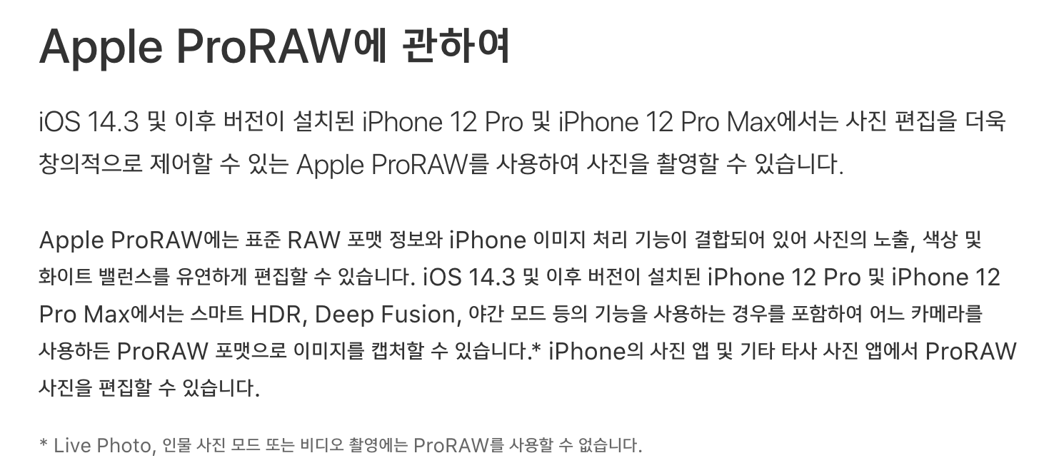 다만, 해당 옵션을 사용하면 사진 파일의 용량이 기하급수적으로 증가할 수 있기 때문에 반드시 주의해야 하며 Live Photo나 인물 사진 모드 또는 비디오 촬영에는 해당하지 않는 기능이니 참고하기 바란다. 아래의 내용은 애플에서 공식적으로 내놓은 Apple ProRAW에 대한 내용이니 읽어보기 바란다.