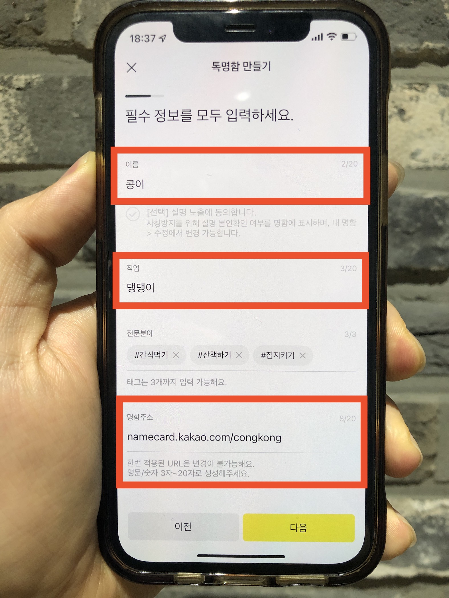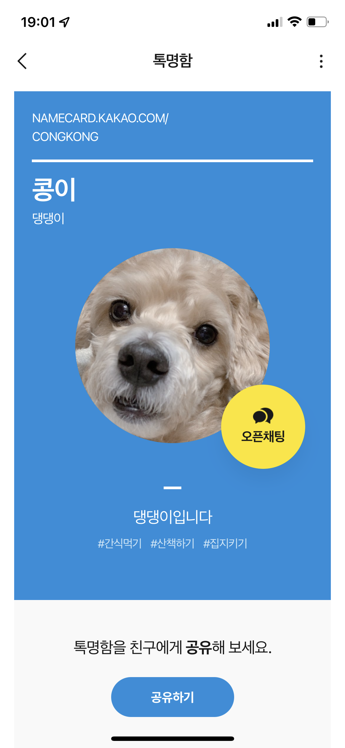 톡 명함 안에는 나에 대한 여러 가지 정보를 입력할 수 있는데 이름부터 직업 그리고 내 전문분야(최대 3가지) 그리고 명함 주소(내가 지정 가능)를 스스로 DIY 할 수 있다는 것이 큰 장점이다. 평범하지 않게 머릿속에 각인될만한 유머와 위트를 섞어서 작성한다면 도움이 되지 않을까 생각한다.