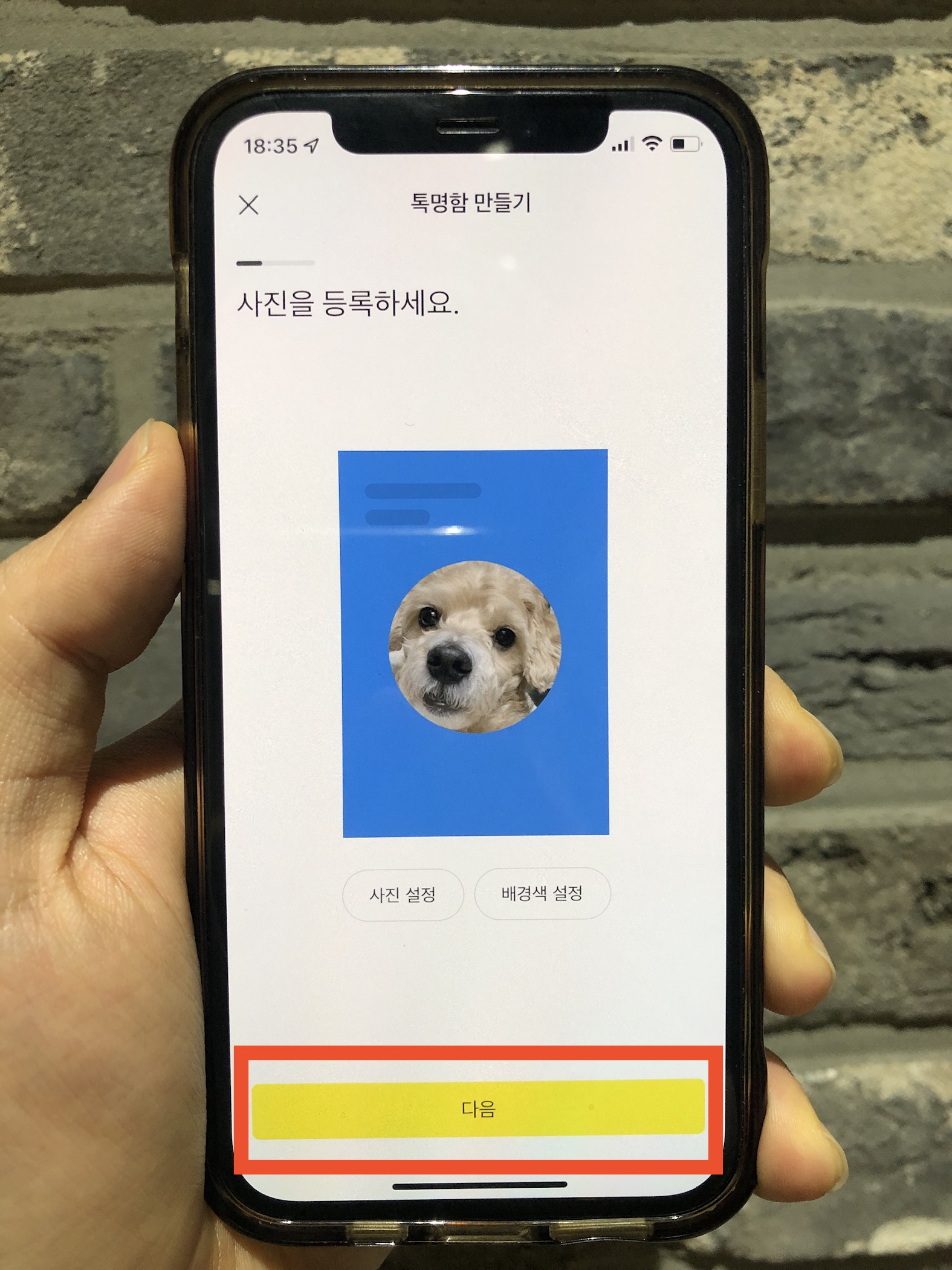 만들 준비는 모두 끝났으니 사진과 배경색을 등록해주어야 한다. 나의 얼굴이 명확하고 신뢰감이 드러나는 사진이 영업인으로써 좋은 인상을 남길 것으로 생각된다. 최대한 깔끔하고 단정한 모습의 사진을 프로필 사진으로 올려주자.