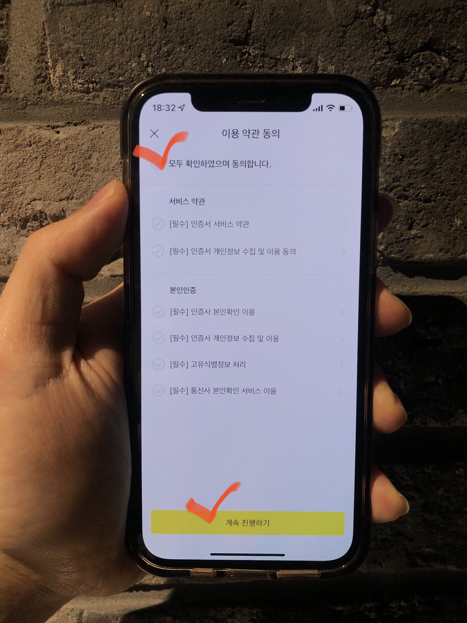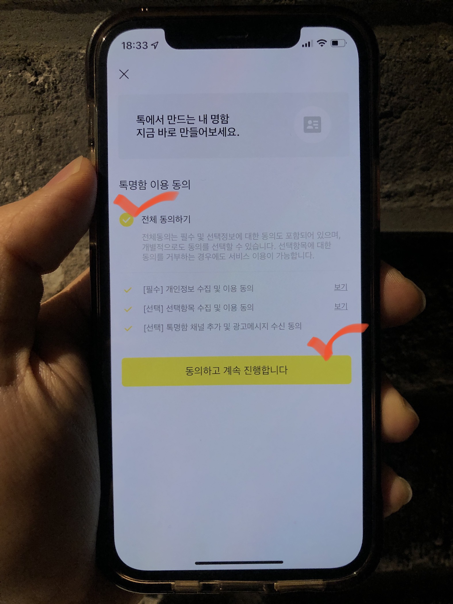 카카오 인증서를 발급받고 본인인증을 완료했다면 아래의 사진처럼 '전체 동의하기'를 누르고 <동의하고 계속 진행합니다>를 눌러서 본격적으로 만들어보자.