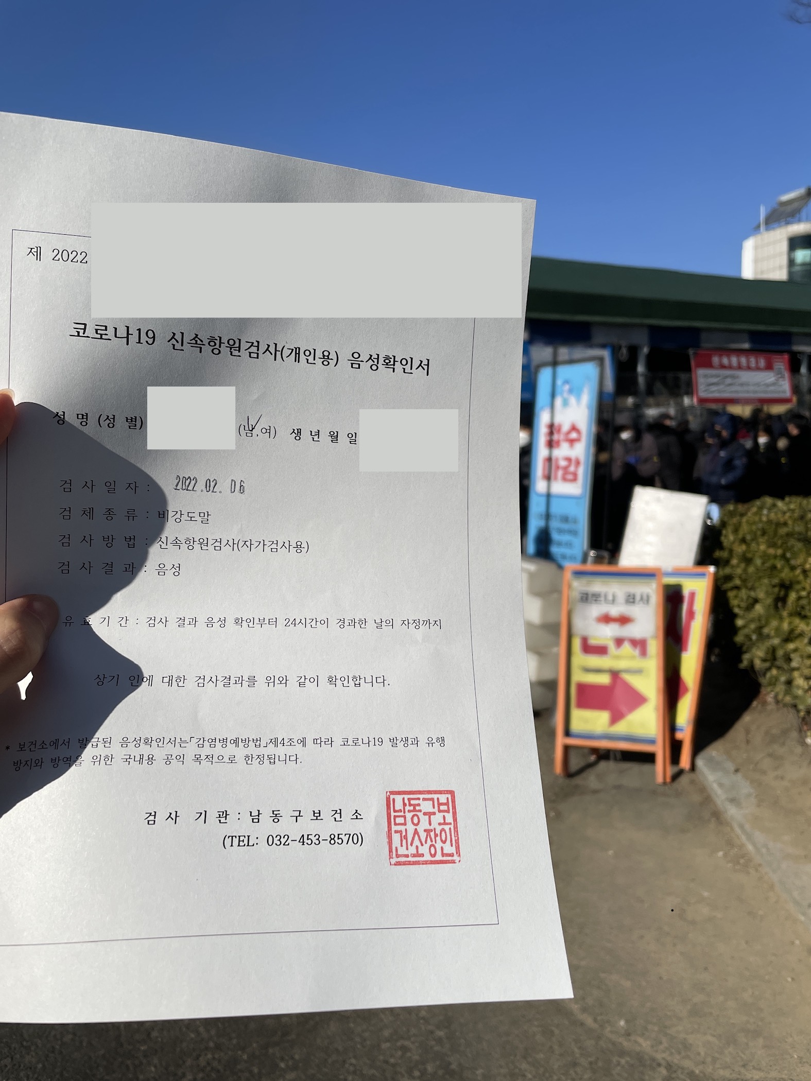 15분 후에 검사 결과 '음성'이 나왔다면 신분증과 검사 결과를 들고'음성 확인서' 발급을 받는 곳에 줄을 서있으면 순서대로 음성 확인서를 발급해줄 것이다. 음성 확인서에는 검사한 날짜와 이름, 생년월일 등이 나오고 검사 기관의 도장까지 나와있기 때문에 이를 들고 다니며 음식점이나 카페 등 방역 패스 적용 시설에서 제출하고 입장하면 된다.
