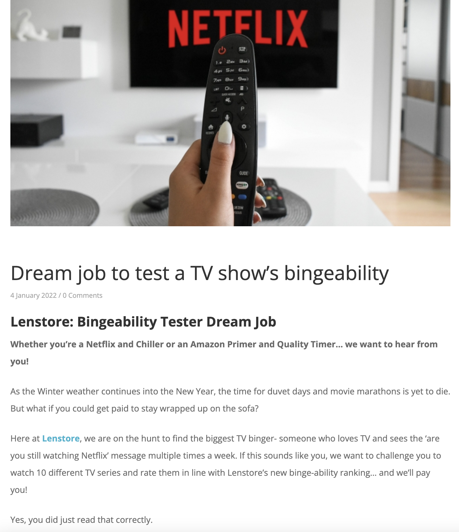 영국에서 사업을 하고 있는 콘택트렌즈 업체 중 하나인 '렌스토어(Lenstore)'에서는 넷플릭스 영상을 보고 질문에 응답하거나 순위를 정하는 아르바이트를 할 사람을 구하고 있다고 한다. 해당 아르바이트에 참가하는 사람이 7천만 원을 받기 위해서 하는 일은 넷플릭스에서 상영하고 있는 브리저튼/오자크/블라인드 러브 등 2022년에 공개 예정인 시리즈를 포함한 넷플릭스의 영상들을 시청하고 해당 업체에서 제공하는 질문들을 기준으로 프로그램들을 평가하기만 하면 된다고 한다.