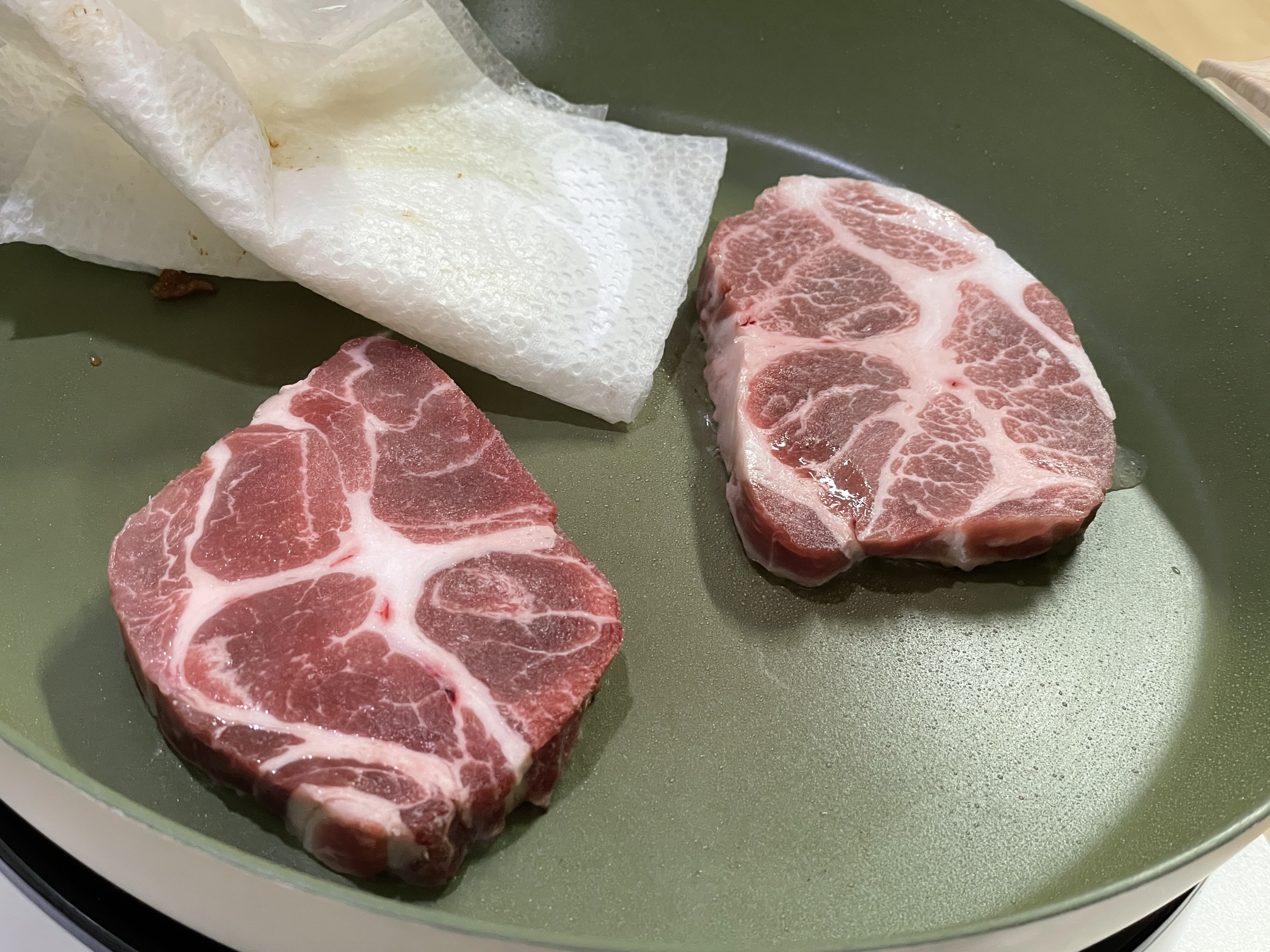 목살은 우리가 애니메이션에서 보던 모양의 '고기 모양'을 하고 있었다. 비계가 적고 살코기가 많은 부위로 유명한 목살은 운동을 하는 사람에게도 좋은 단백질 공급원인만큼, 항정살보다는 조금 퍽퍽할 거라 예상했다.