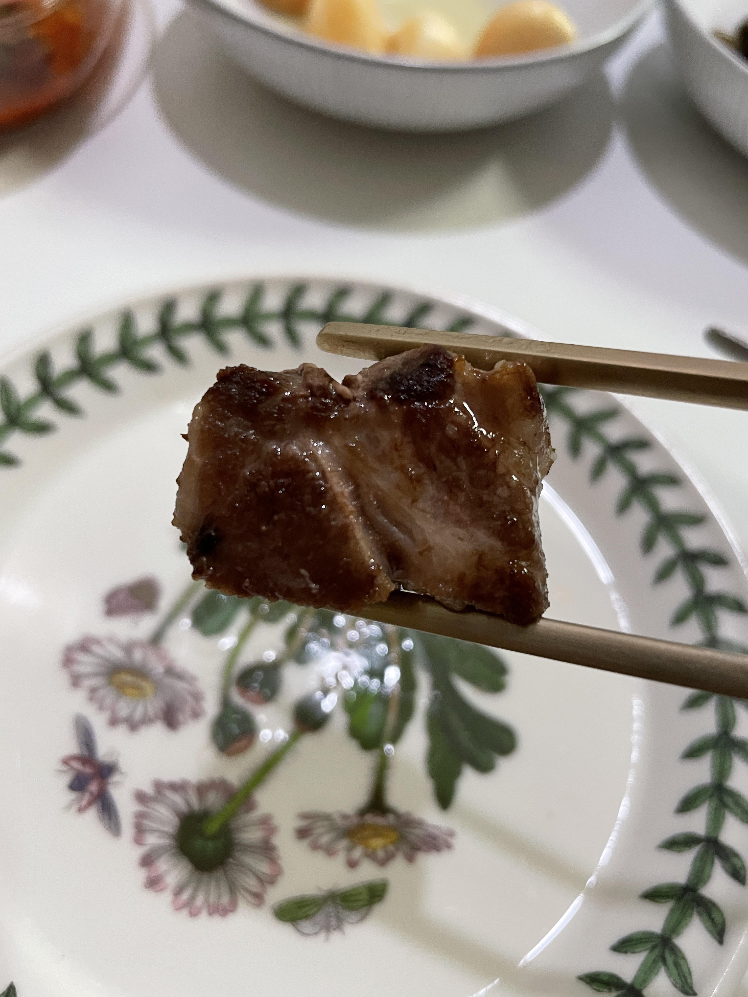 가장 궁금했던 부위를 마지막에 먹어보기로 했다. 생긴 모양은 약간 소고기 갈빗살과 비슷하게 생겼는데, 무슨 맛을 보여줄지 궁금하기도 했고 와이프와 내가 좋아하는 부위들은 다 먹어봤기에 새로운 맛(?)을 찾아서 먹어보기로 했다.