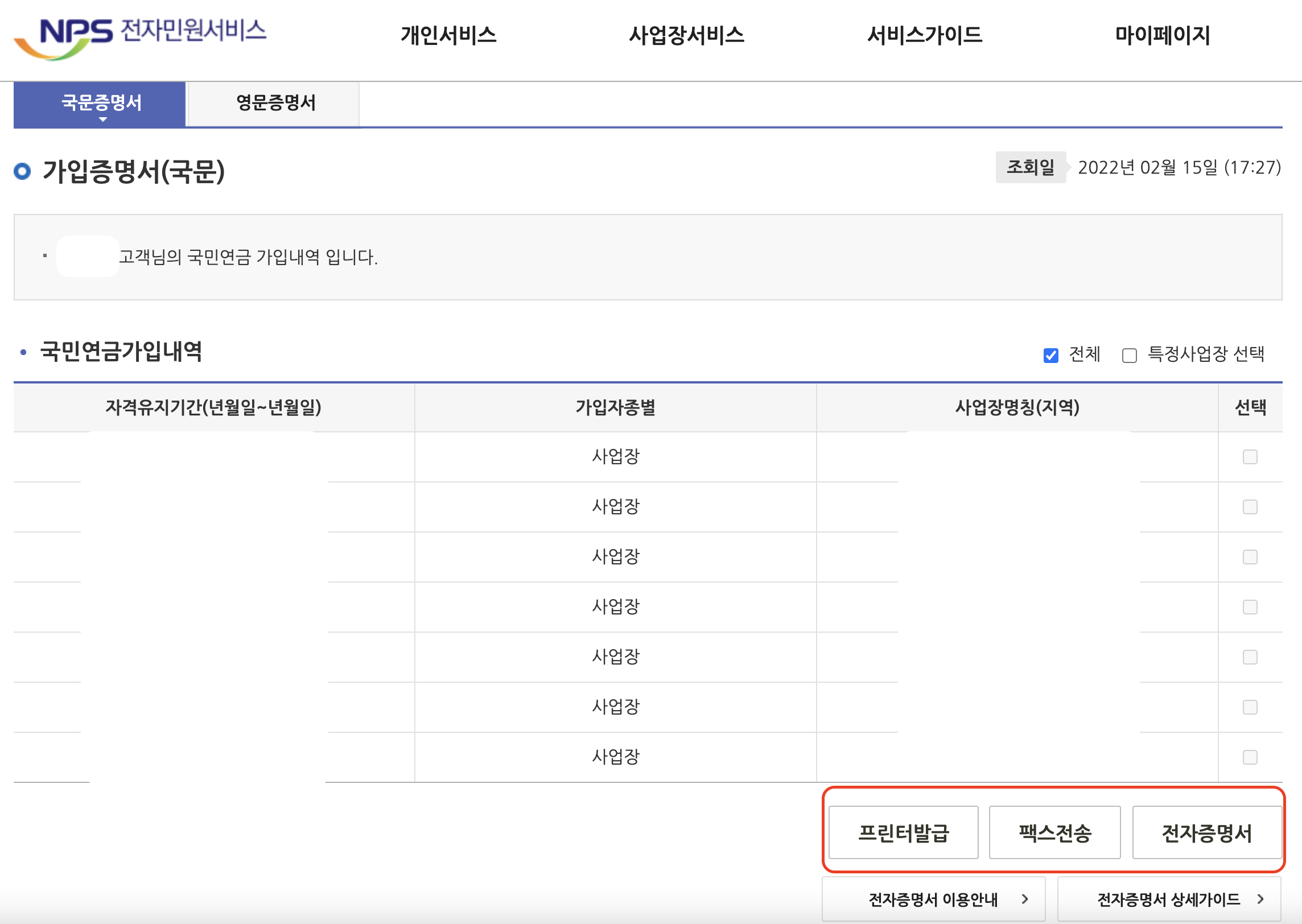 만약, 국민연금 가입증명 중에서 특정 사업장에 대한 것만 발급을 받고 싶다면 가장 우측에 <선택>에서 원하는 사업장의 것을 클릭해서 발급받을 수 있으며 증명서 발급은 <프린터 발급>, <팩스 전송>, <전자증명서>의 방법 중에서 본인이 원하는 방법을 선택해서 발급이 가능하다.