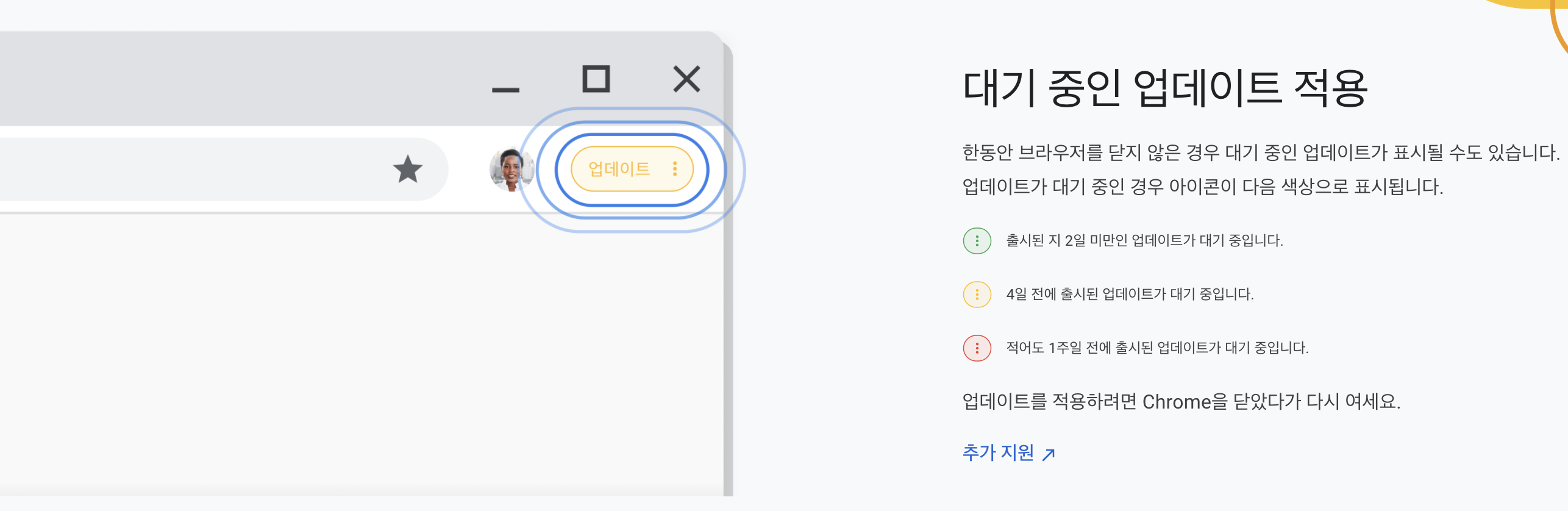 우선 크롬 브라우저 홈페이지에서 아래의 사진을 가져왔다. 아래의 사진을 보면 브라우저 우측 상단에 보이는 색에 따라서 업데이트가 얼마나 미뤄졌는지 확인이 가능하다.