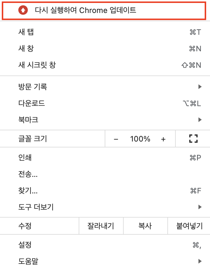 2. 노출된 메뉴 중 <다시 실행하여 Chrome 업데이트> 클릭