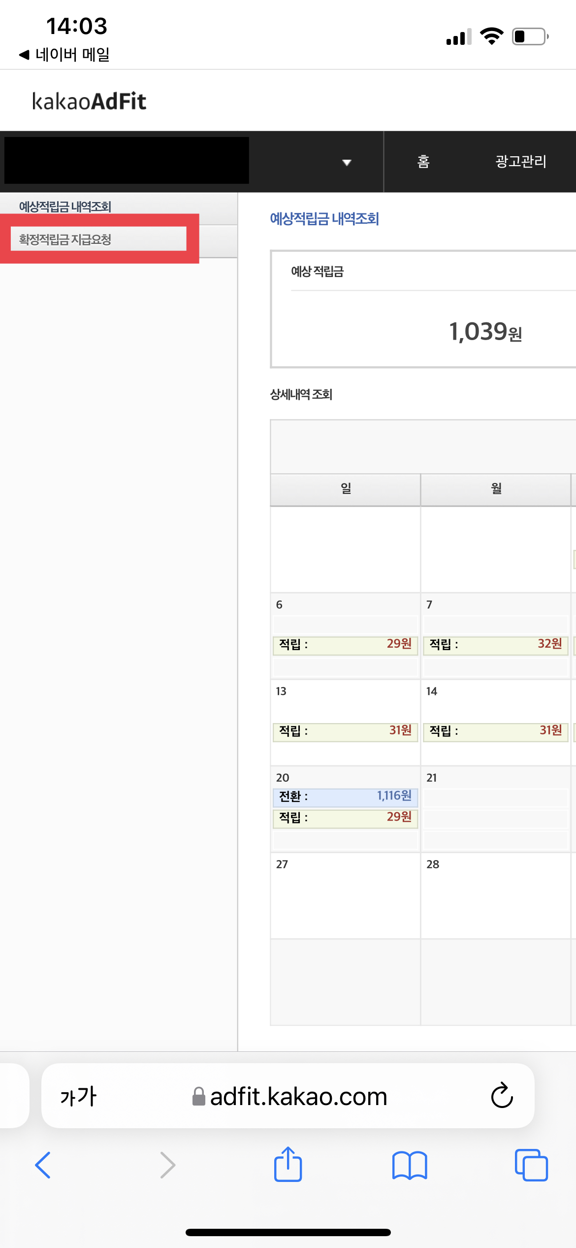 위의 사진에서 오른쪽 위에 보면 <적립금>이라는 탭이 보일 것이다. 해당 탭을 클릭하면 아래의 사진과 같은 화면이 나오게 된다. 여기서 내 예상 적립금과 함께 <확정 적립금 지급요청>이라는 메뉴가 보일 텐데 해당 메뉴를 클릭해준다.