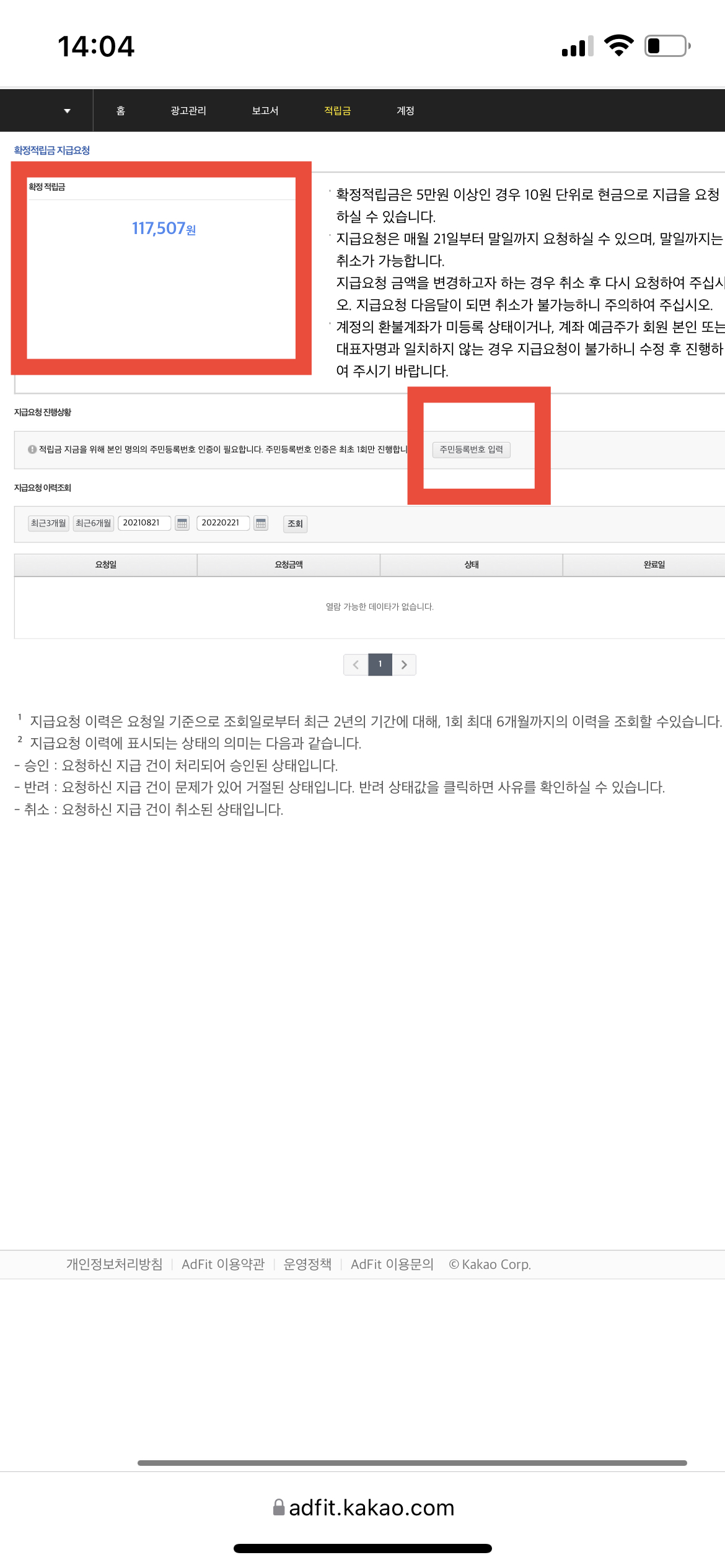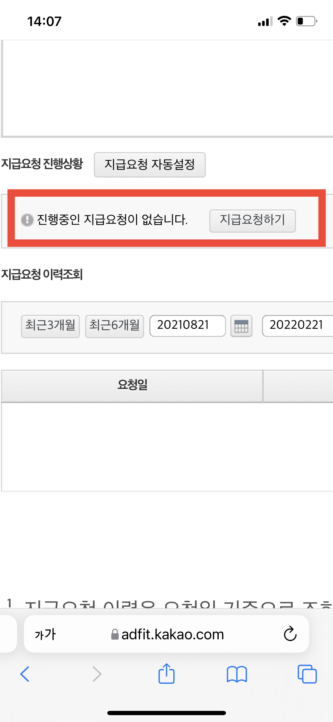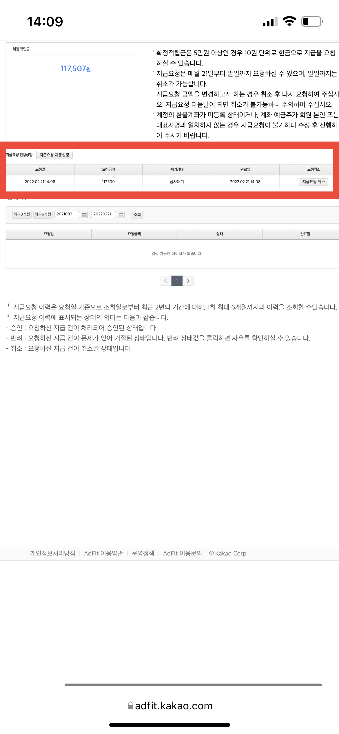 또한, 애드 핏 사이트에서 내가 지급요청을 한 금액 와 날짜를 알 수 있으며, 말일 전에는 지급요청에 대한 취소도 가능하다고 한다. 그리고 내가 단단히 착각하고 있었던 것 중 하나가, 매 달 애드 핏 수익을 21일부터 말일까지 신청할 수 있고, 이번 달에 신청한 수익금은 다음 달 20일에 입금된다고 한다. 그러니 내가 치맥을 사 먹으려면 다음 달 20일에나 사 먹어야 하는 것이다.