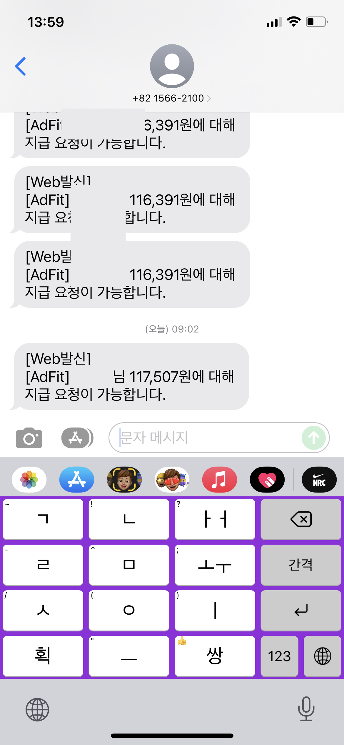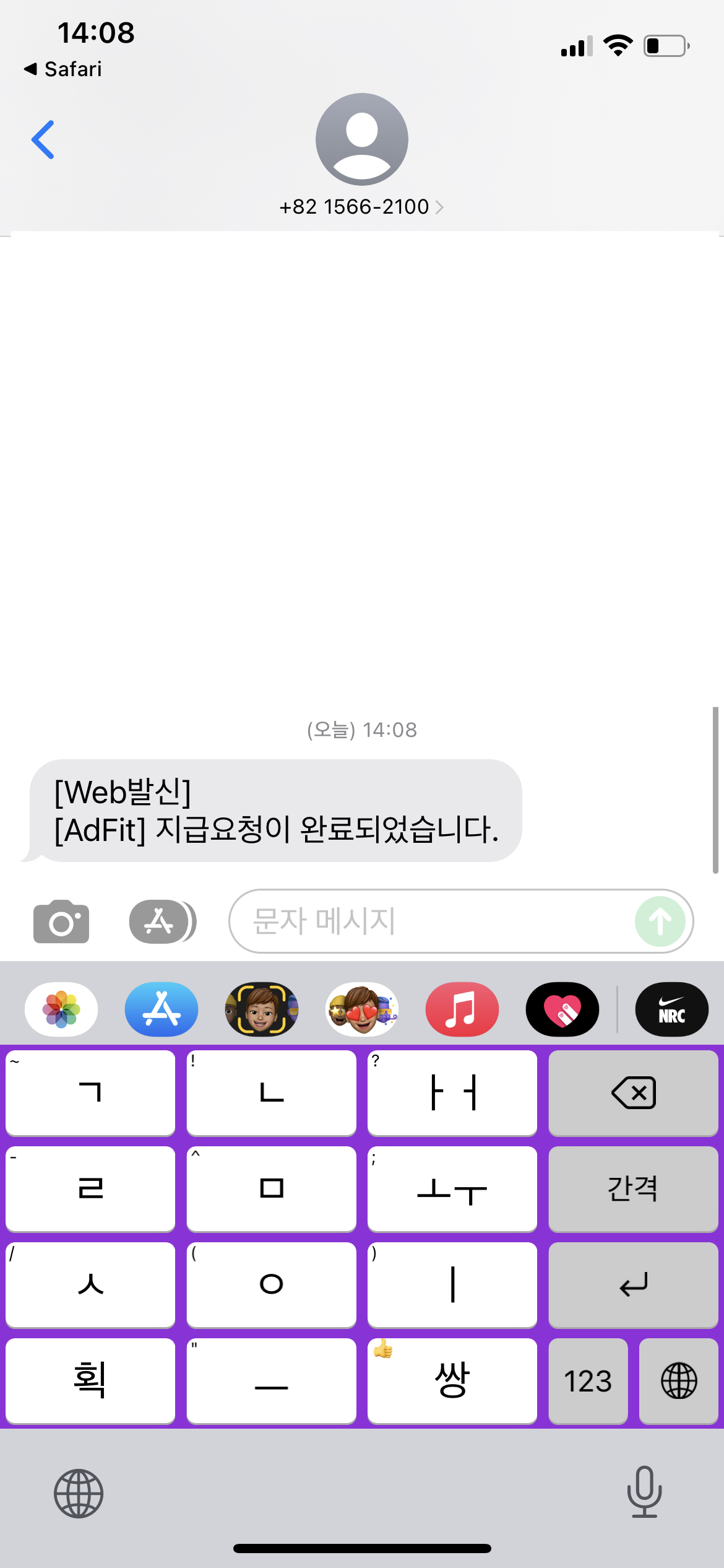 지급요청이 완료되면 애드 핏에 등록되어있는 휴대전화 번호로 나에게 문자가 아래 사진처럼 온다.
