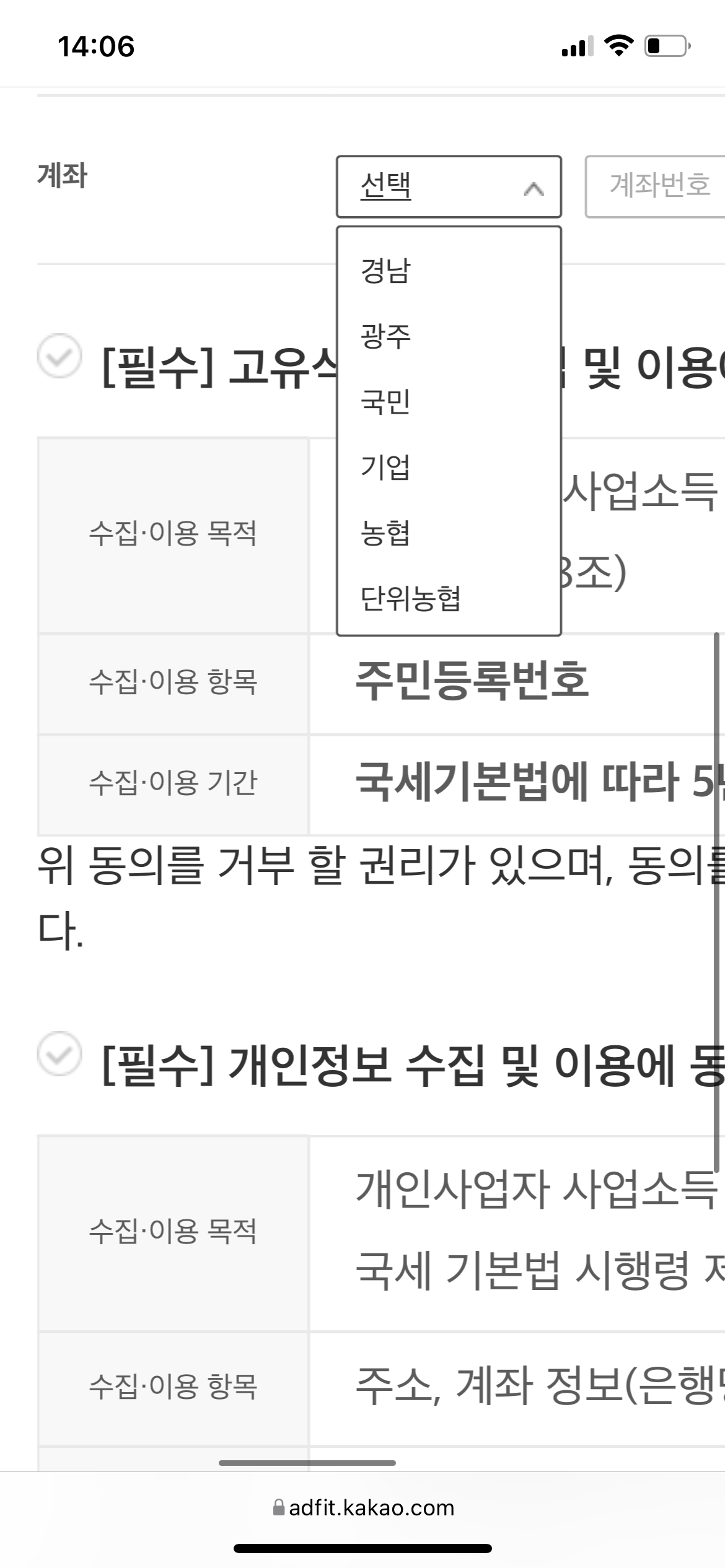 그리고 주소와 주민등록번호를 입력하면 아래의 사진에서 요구하는 은행 중 하나의 은행계좌를 입력하고 예금주 실명확인까지 마쳐주어야 한다. 나는 주거래은행이 다행히 있어서 주거래은행으로 입력하고 예금주 확인을 마무리했다.