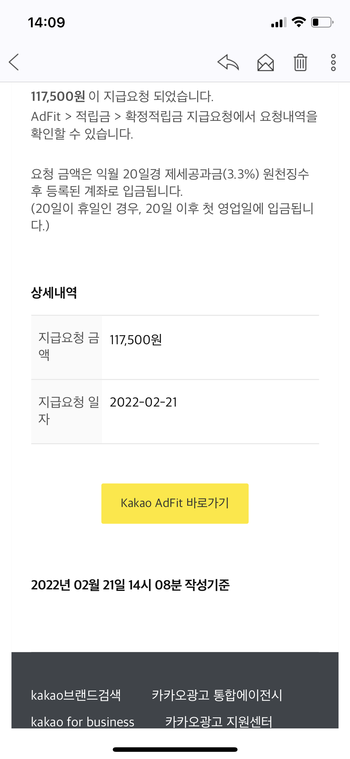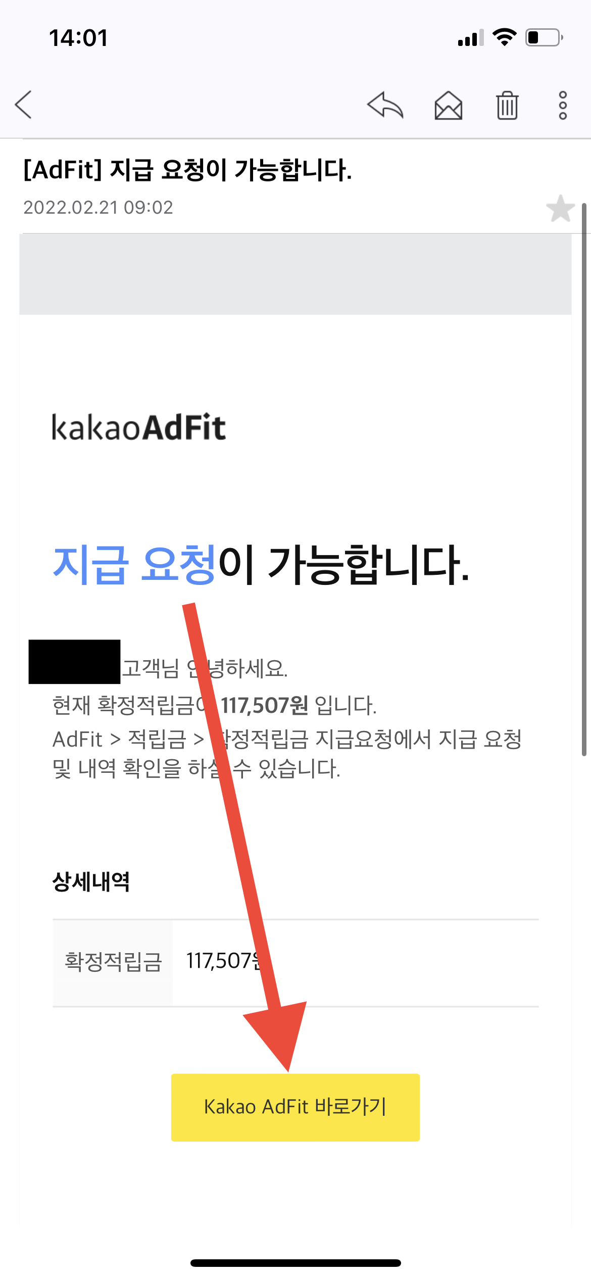 애드 핏에서 보낸 이메일을 열어보면 아래와 같은 내용이 보일 것이다. 금액은 각자가 다를 것인데, 5만 원 이상 쌓인 사람에게만 출금요청에 대한 문자가 오기 때문에 "왜 나는 안 오지?"하고 생각하기 전에 내가 출금 가능한 금액이 5만 원 이상인지 확인부터 하기 바란다.