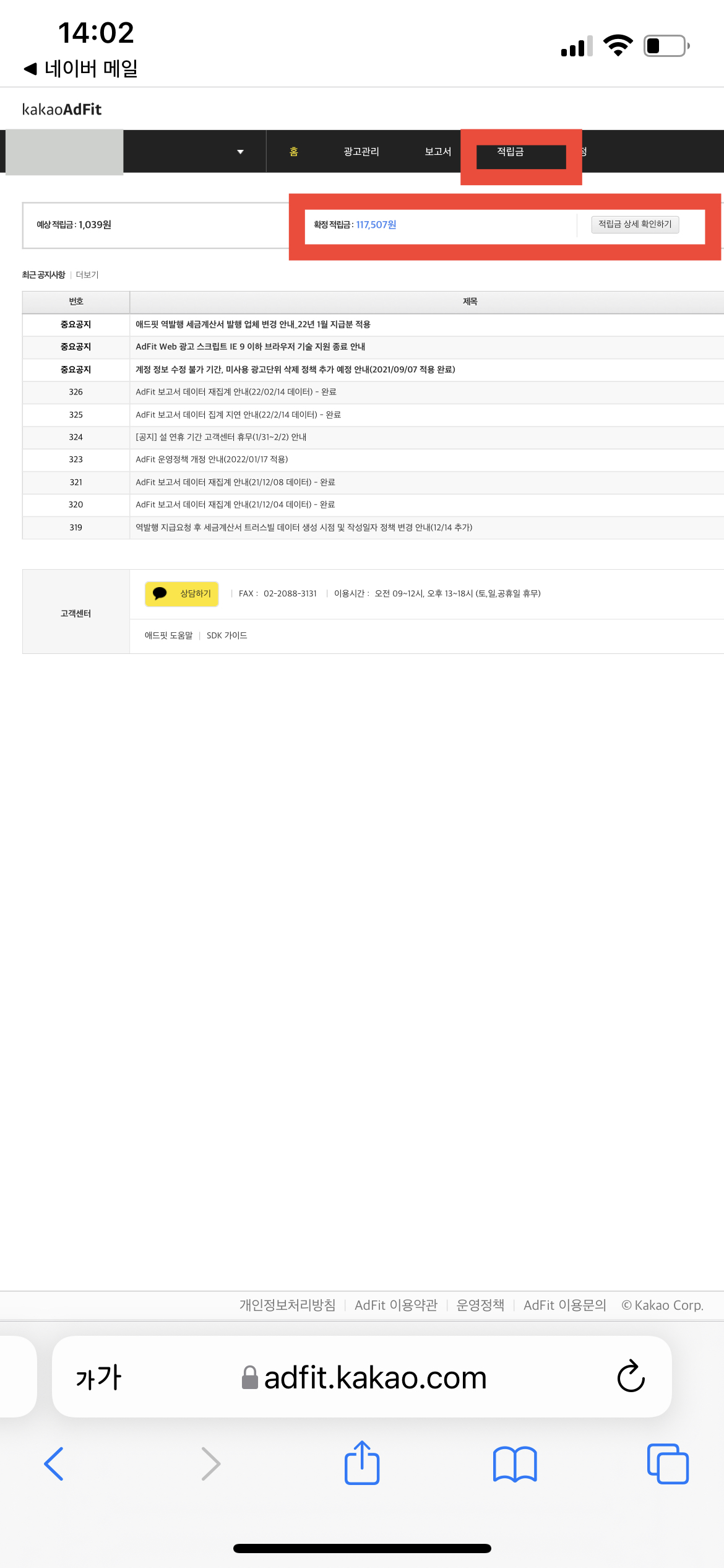 애드 핏 홈페이지에 가면 광고로 인해 적립금이 얼마나 쌓여있는지 알 수 있는데, 아래 사진에서처럼 <확정 적립금>이라고 쓰여있는 곳에 파란색 글씨로 숫자가 쓰여있을 거고 해당 금액이 본인이 출금 가능한 금액이라고 생각하면 된다. 나의 애드 핏 수익 중에서 출금 가능한 금액인 117,507원이다.