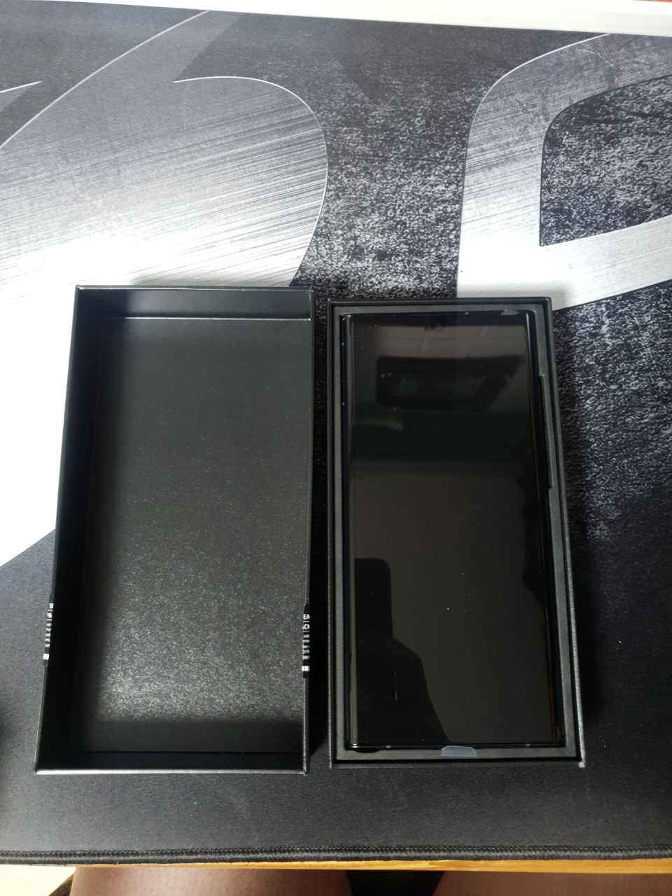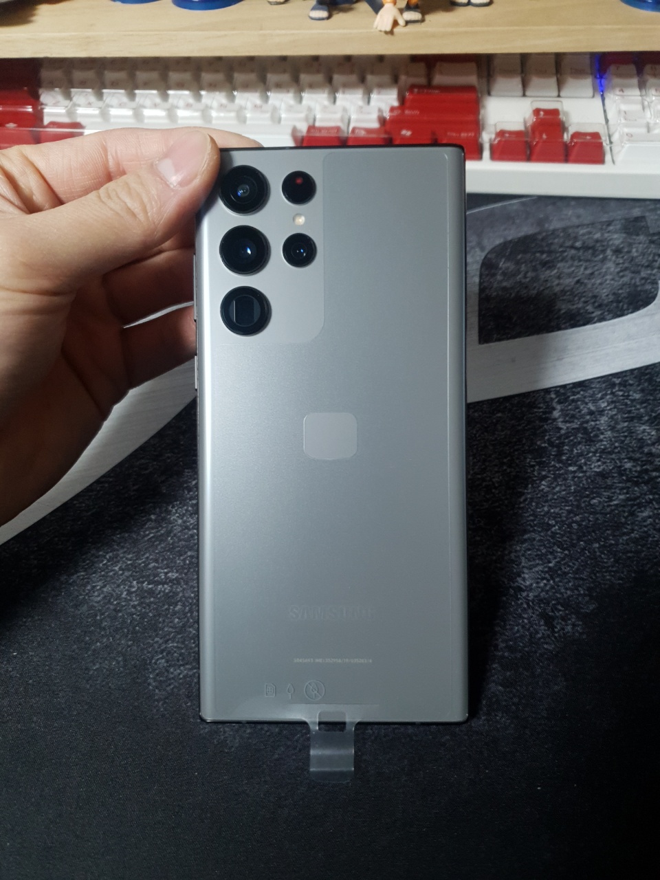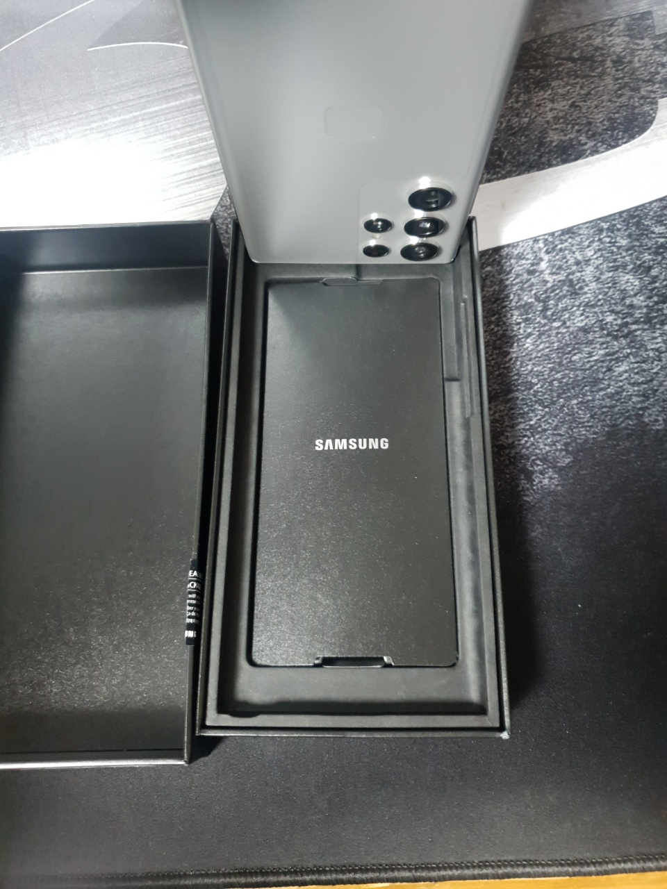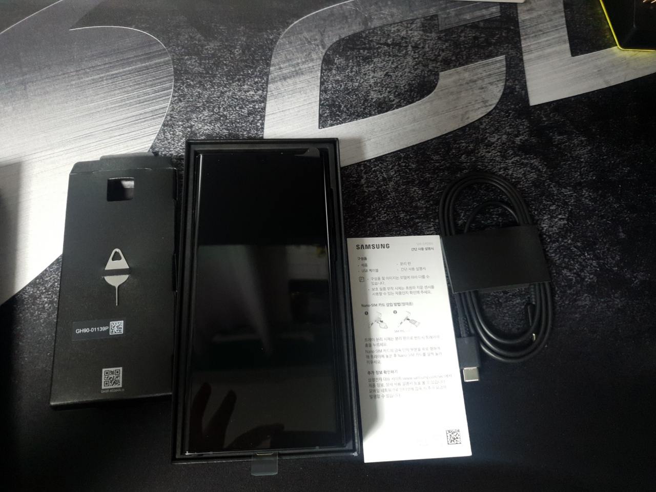 구성품은 생각보다 단순했다. 스마트폰 본체와 함께 USIM을 끼우는데 도움을 주는 TOOL과 함께 충전기 연결선과 설명서였다. 사실 뭐 이것저것 오기를 기대한 것은 아니었지만(?) 은근히 생각보다 단출하게 구성품이 담겨있으니 허전한 마음이 들기도 했다. 아무래도 가격을 올리지 않아서 그런 건지, 애플처럼 지구환경을 생각해서 주지 않은 건지는 모르겠지만.. 일단 액정은 흠잡을 곳 없이 깔끔했고, 그라파이트 색상의 경우 펜의 색상이 크게 영향을 끼치지는 않았으나, 갤럭시 S22 울트라의 모든 색상에 '검은색' S펜이 들어간다는 것은 누군가는 아쉬워할 하나의 디테일이 아닐까 생각한다. (혹시 까짐 현상 때문에 이렇게 한 걸지도) 가장 궁금한 것은 뒷면의 그라파이트 색상이었다.