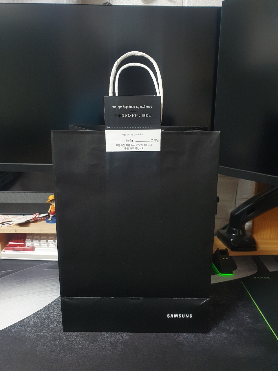 일단 택배가 왔다는 소리에 달려 나갔다. 달려 나가서 택배를 풀어보니 아래의 사진처럼 내가 직접 매장에 가서 구매한 느낌이 나도록 쇼핑백에 포장해주었다. 쇼핑백을 열어보면 멋들어진 갤럭시 S22의 로고와 함께 박스 하나가 나온다.