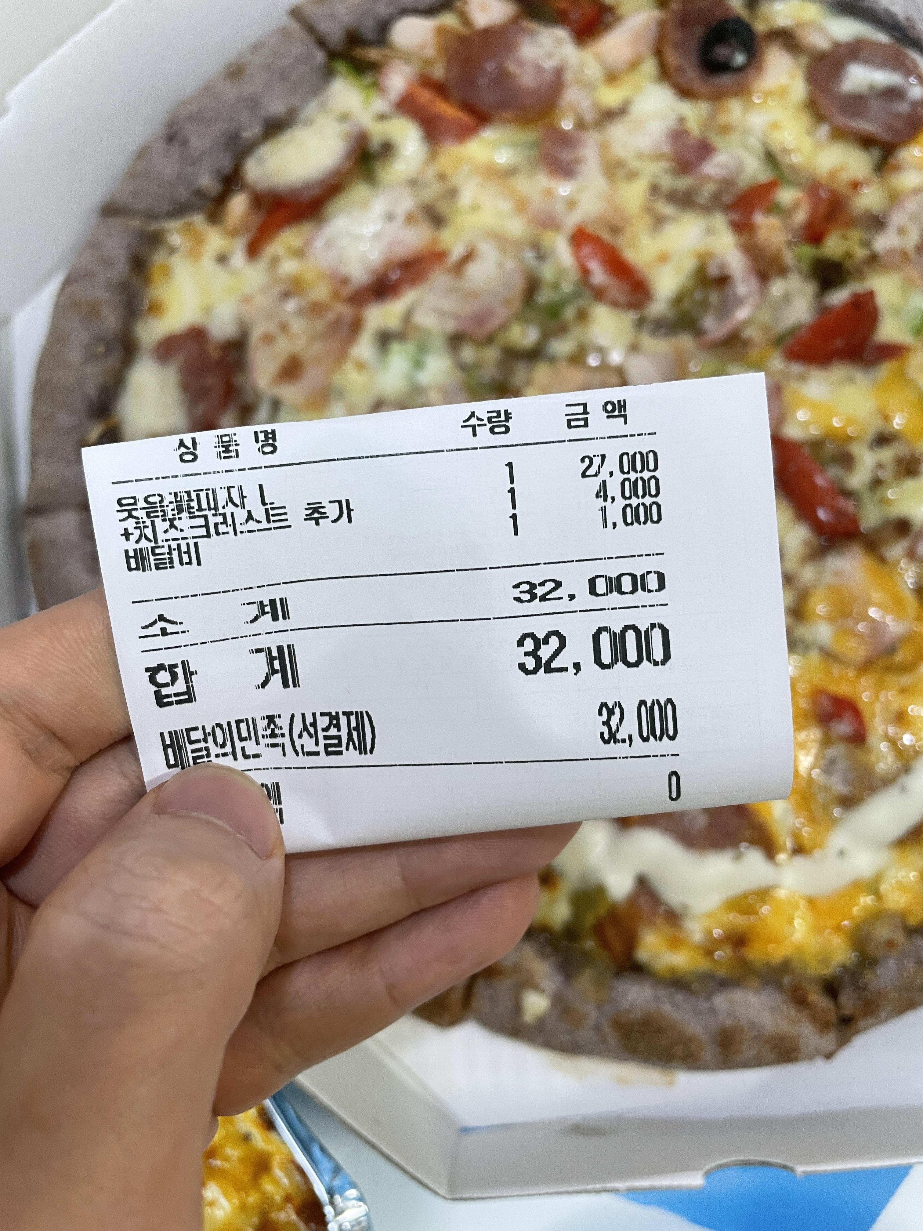 사실 첫 인상은 배달 온 피자를 열었을 때의 향과 토핑의 푸짐함으로 결정이 난다고 생각한다. 32,000원이라는 금액을 지불하고 받은 피자라서 엄청나게 기대를 했는데, 역시 피자에 진심인 회사라서 그런지 묵직하고 피자가 생각보다 엄청나게 크다는 생각이 들었다.