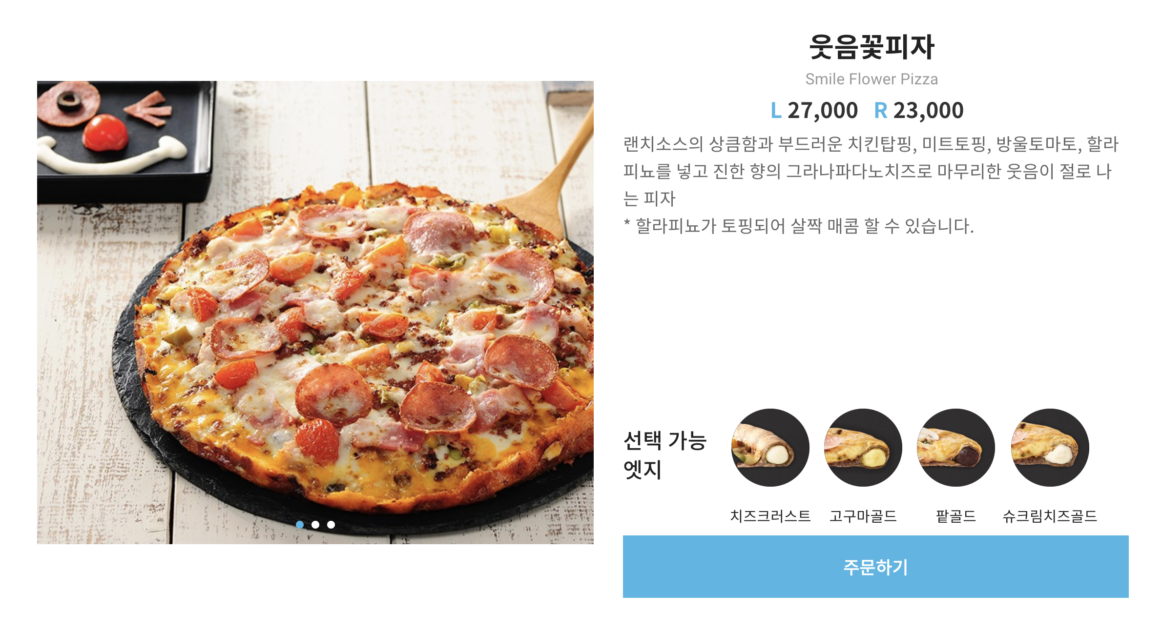 피자알볼로 메뉴들은 이름이 다 독특했다. 어깨피자, 꿈을피자 등 다양한 메뉴들이 있었는데 유독 그중에서 마음에 드는 메뉴가 있었는데 그게 바로 이번에 주문한 <웃음꽃피자>였다. 피자알볼로 홈페이지에 가보면 상세한 피자에 대한 설명을 볼 수 있는데, 사실 홈페이지는 처음 들어가 봤는데 뭔가 피자에 '진심'이 느껴지는 글들이 많았다. 아무튼.