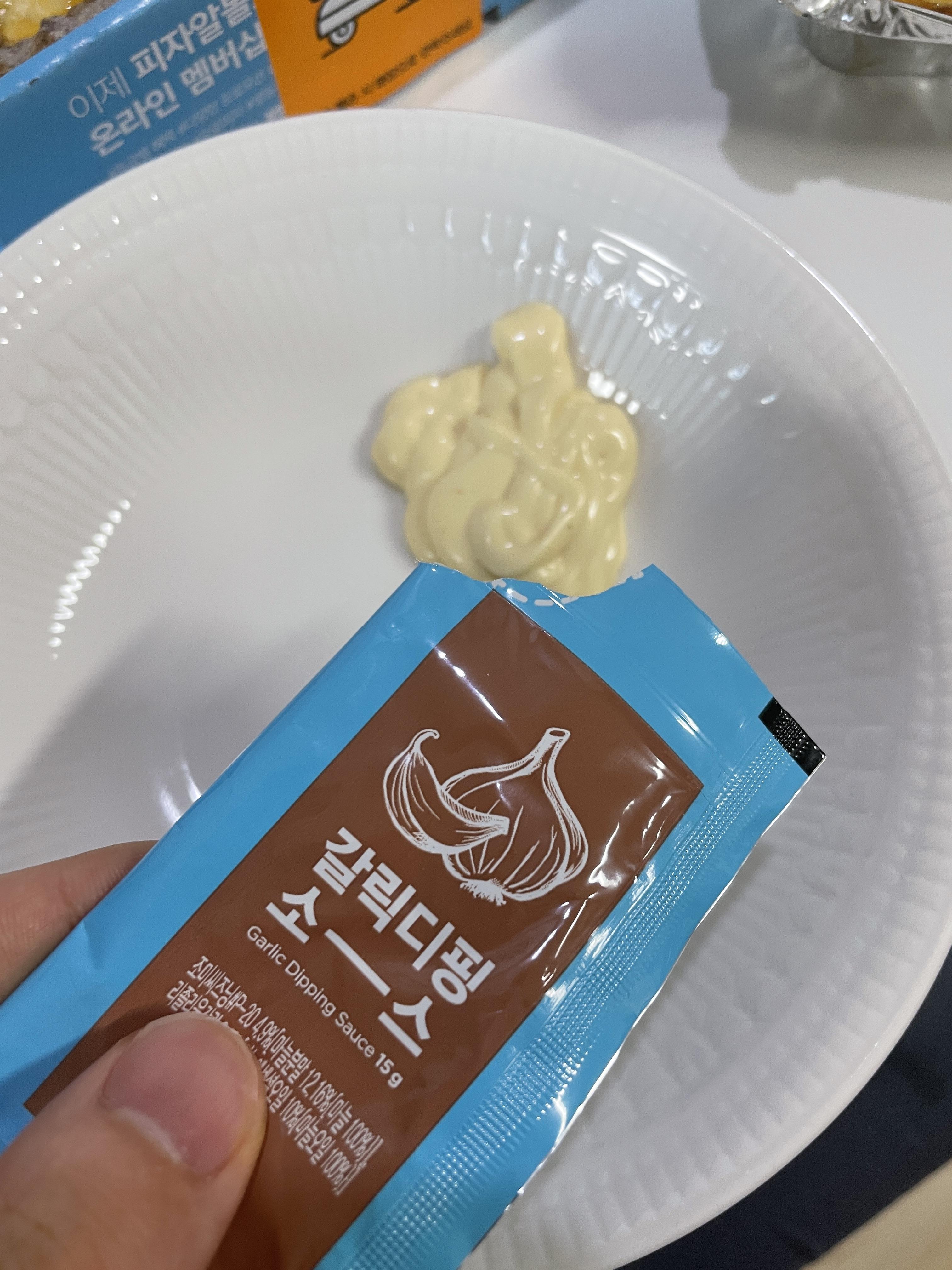 피자를 맛있게 먹기 위해서 꼭 필요한 '갈릭 디핑 소스' 가뜩이나 그라나파다노 치즈 덕분에 치즈 향이 엄청난데 치즈크러스트까지 엣지로 만들어서 찍어먹을 소스가 꼭 필요했다.(느끼한 걸 잘 못 먹는 타입)