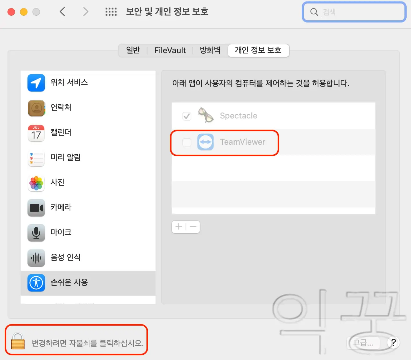 변경을 위해서 위에서 한 것과 같이 '자물쇠 그림'을 클릭하고 비밀번호를 입력해 설정을 변경할 수 있도록 해주어야 한다. 그리고 팀뷰어 앞의 체크박스를 클릭해서 팀뷰어를 활성화시켜주자.