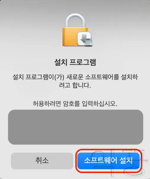 <설치> 버튼을 누르면 맥은 암호를 이용해서 하드디스크 잠금을 풀어줘야 하고, 잠금을 해제한 뒤에는 소프트웨어 설치가 진행된다.
