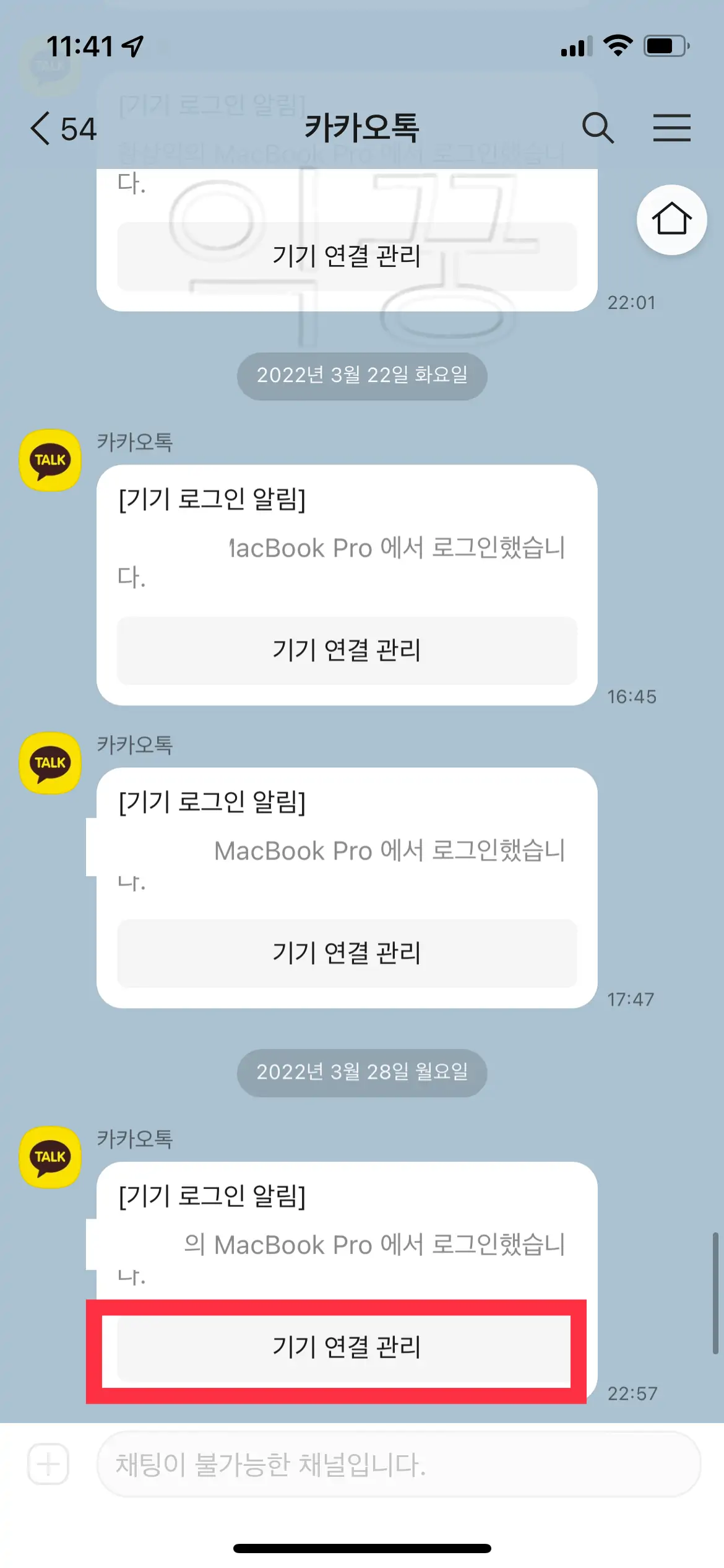 인증 해제의 경우 PC에 카카오톡 로그인을 할 때마다 모바일 카카오톡에 알림이 오는데, 아래의 좌측 사진처럼 해당 알람이 온 카카오톡 메시지에 들어가서 <기기 연결 관리> 부분을 클릭하고 그 이후에 우측 사진처럼 기기 옆에 있는 <로그아웃> 버튼을 눌러서 연결을 해지하면 된다.