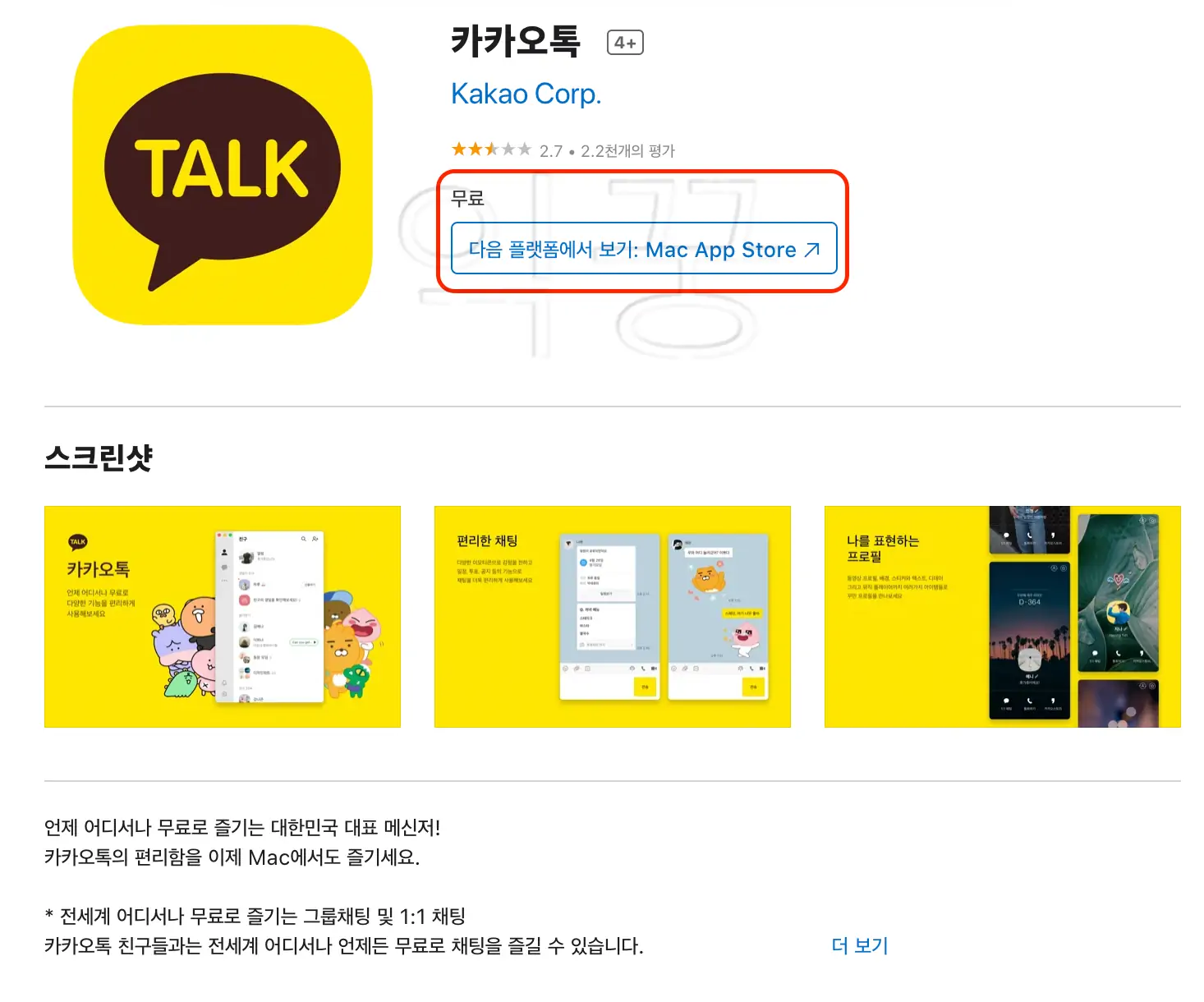 macOS를 사용하는 경우에는 카카오톡 홈페이지가 아닌 애플에서 운영하는 앱스토어에 macOS가 연동되어 있어서 바로 다운로드가 가능하며 굳이 홈페이지에서 설치 파일을 받을 필요가 없다.