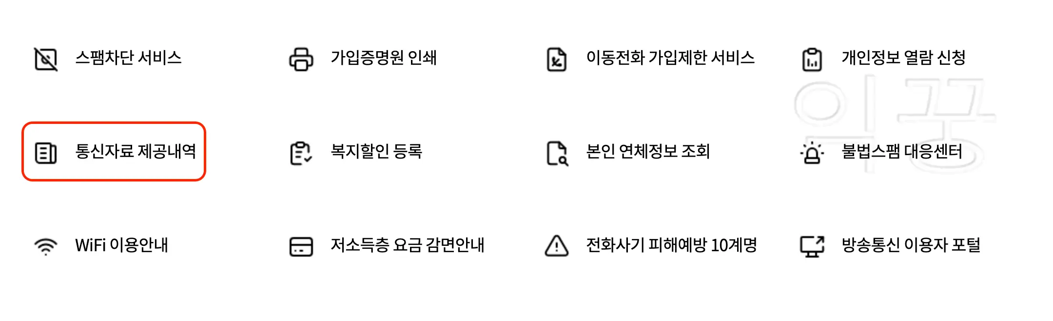 고객지원 탭 클릭 후 나오는 다양한 메뉴들 중에서 <통신자료 제공내역 열람> 아이콘을 클릭하자.