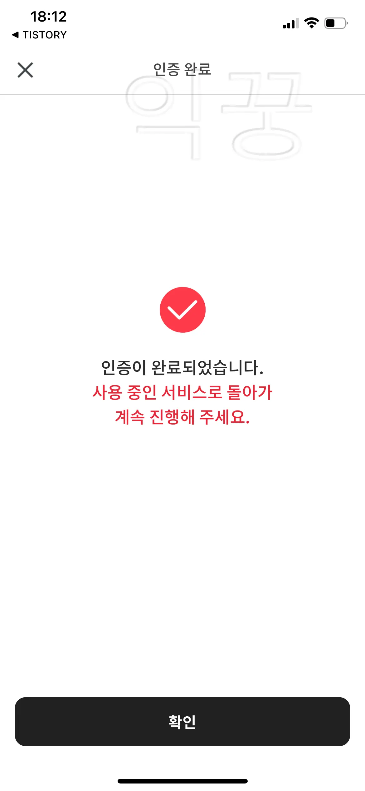 PASS 앱을 통해서 본인인증을 할 경우에는 아래의 사진처럼 앱을 통해서 본인인증 요청이 온다. 본인인증 완료 후에는 <확인> 버튼을 눌러서 다시 PC 화면에서 절차를 진행해주면 된다.