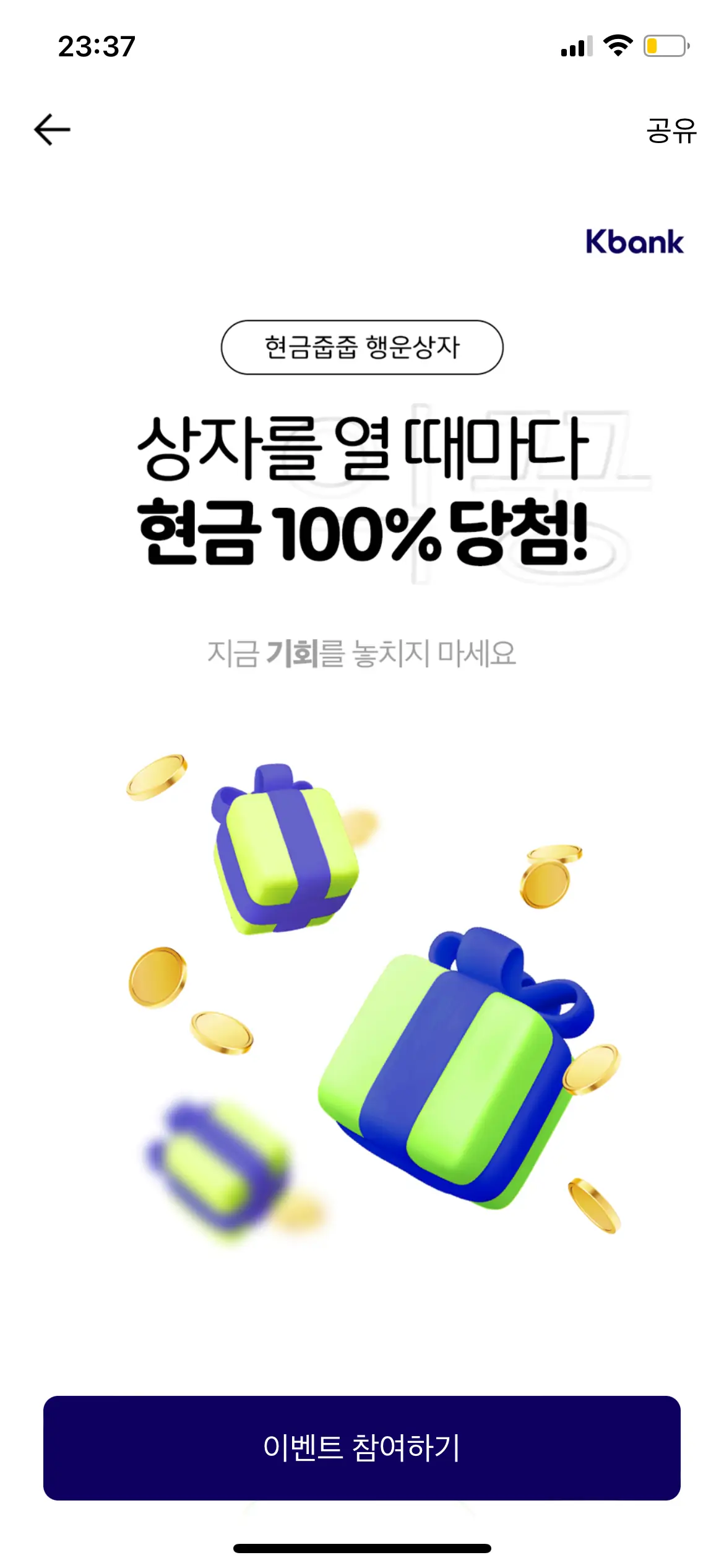 우리는 '앱테크' 목적으로 케이뱅크 계좌를 개설했기 때문에 우측 상단의 선물박스 모양의 아이콘을 바로 눌러주도록 하자. 이 아이콘이 케이뱅크의 행운 상자다. 오른쪽 사진과 같은 화면이 나오고 화면 하단의 <이벤트 참여하기> 버튼을 눌러주면 된다.