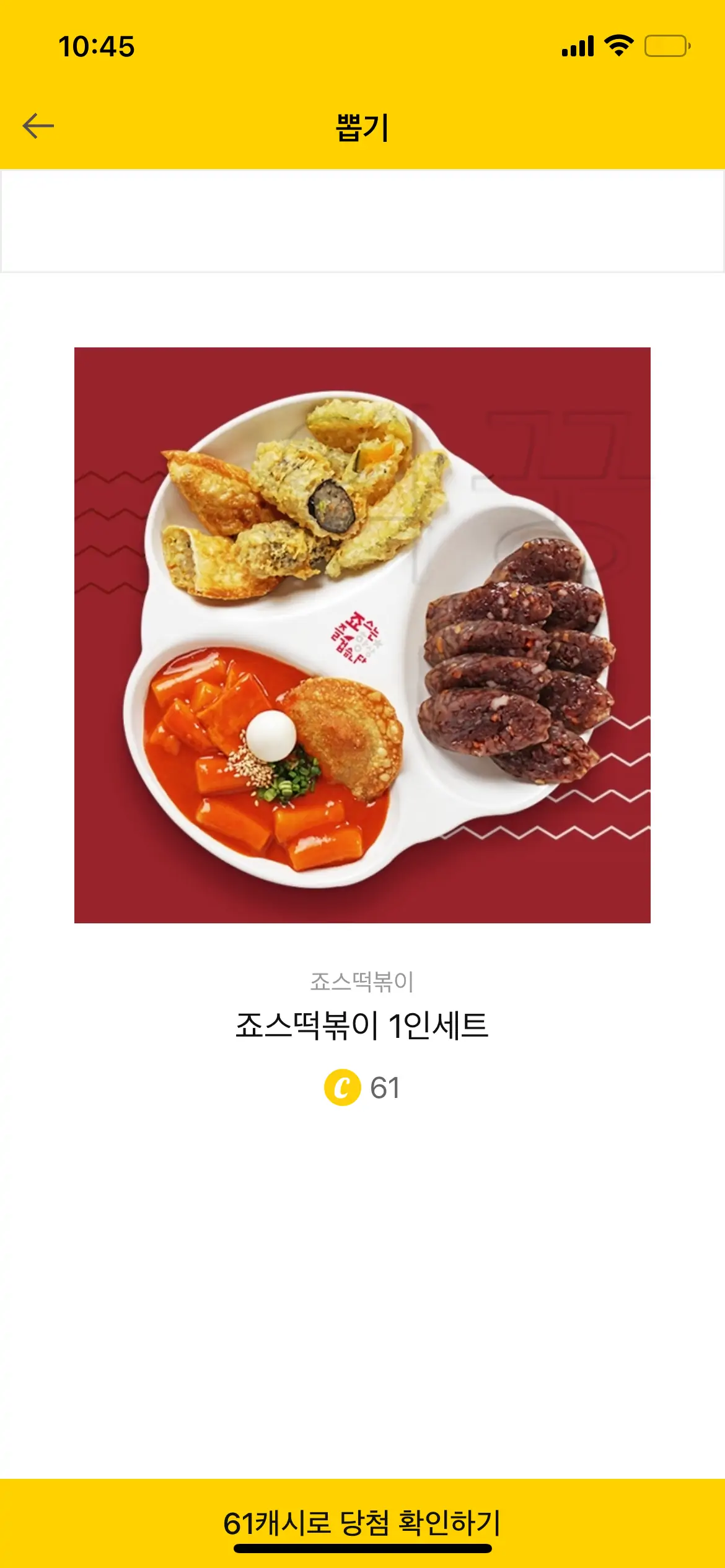 가장 가성비가 좋아 보이는 것은 스타벅스 아메리카노와 죠스떡볶이 1인 세트로 61 캐시(61원)를 지불하고 약 5,000원에 가까운 경품을 받을 수 있는 이벤트이기 때문에 참여해보기를 바란다.