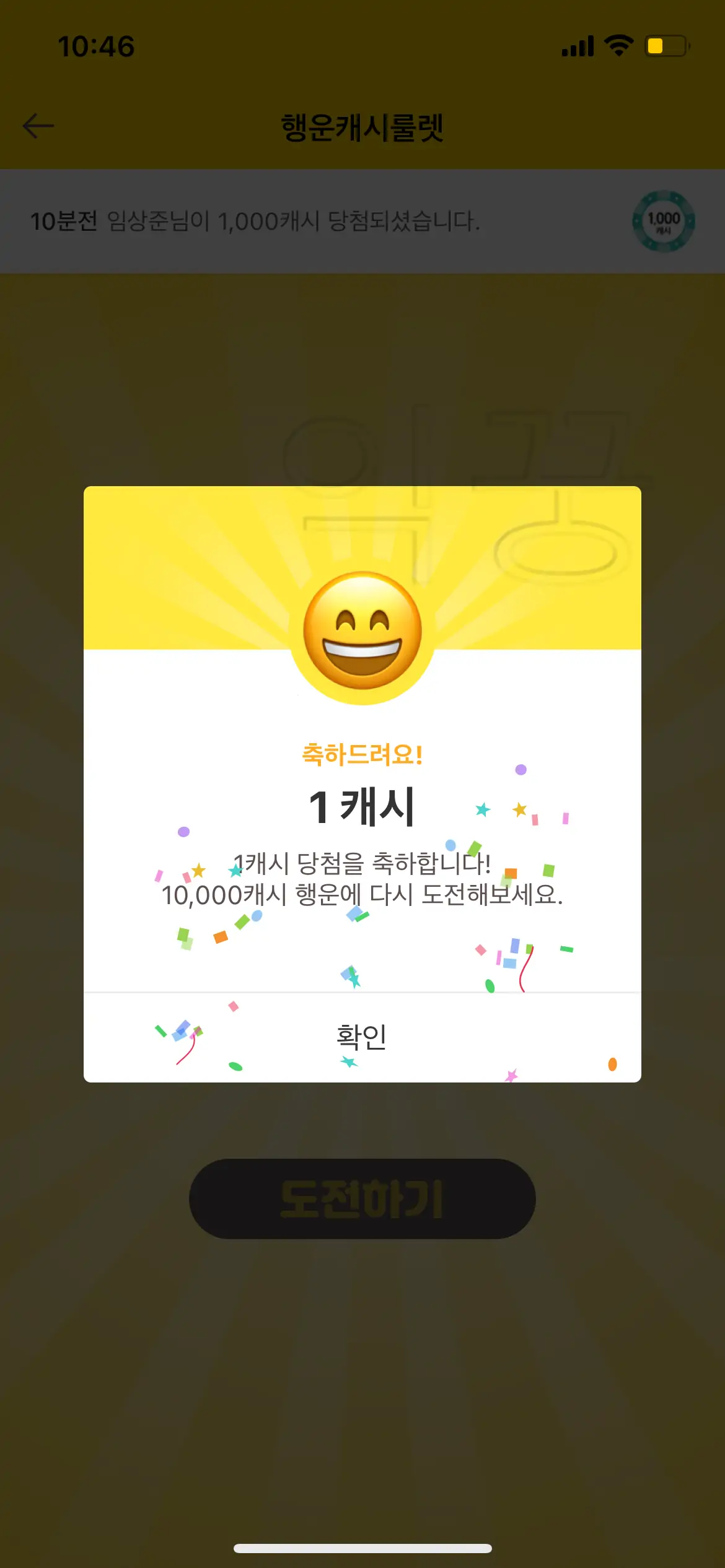 아마 대부분은 1원이 당첨될 것으로 보인다. 나도 1원만 당첨돼 보고 아직까지 1,000원 이상 당첨이 된 적은 없다. 그냥 심심할 때 하다 보면 언젠가는 될 거라 생각하고 무념무상으로 누르곤 한다.