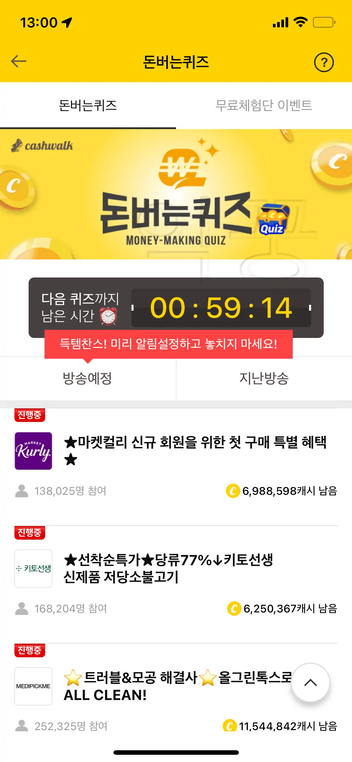 퀴즈를 풀고 나면 위의 오른쪽 사진처럼 당첨금이 지급된다. 퀴즈를 풀고 나면 보상은 기본적으로 20~30 캐시 사이가 지급되지만 운이 좋다면 1,000 캐시 또는 10,000 캐시를 받을 수도 있기 때문에 매 시간마다 1분 정도 시간을 내서 반드시 퀴즈를 다 푸는 것을 추천한다.
