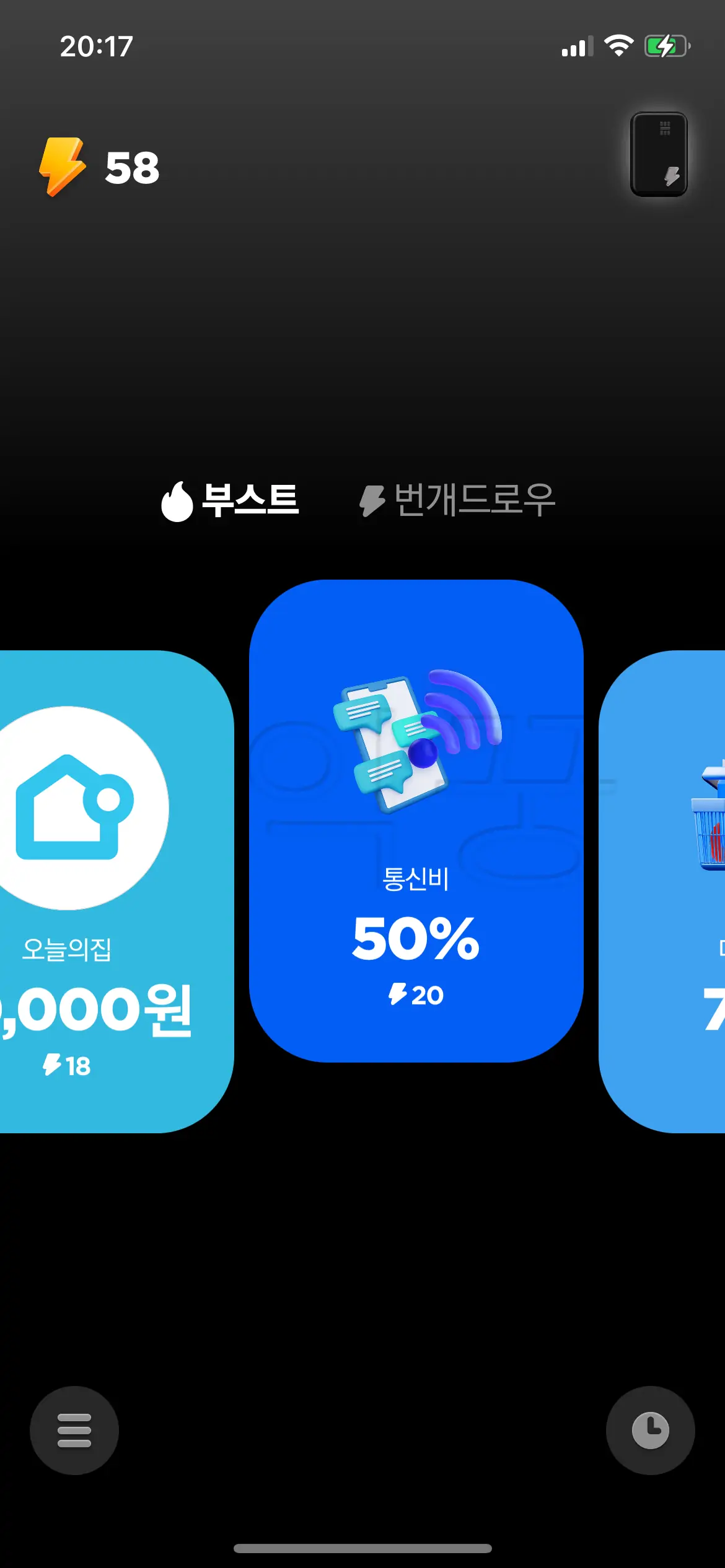 아이콘을 누르면 우측 하단에 보이는 사진처럼 현재 '차이 앱'에서 내가 부스트 한 항목이 나오고, 부스트의 '유효기간'까지 옆에 나온다. 내 경우는 7일 이내에 휴대폰 통신비가 차이카드로 결제되면 최대 10,000원이 할인되어 캐시백 되는 것이다. 전월실적이나 조건을 따지지 않고 그저 차이에서 사용하는 '번개'만 넉넉하게 가지고 있다면 충분하다.