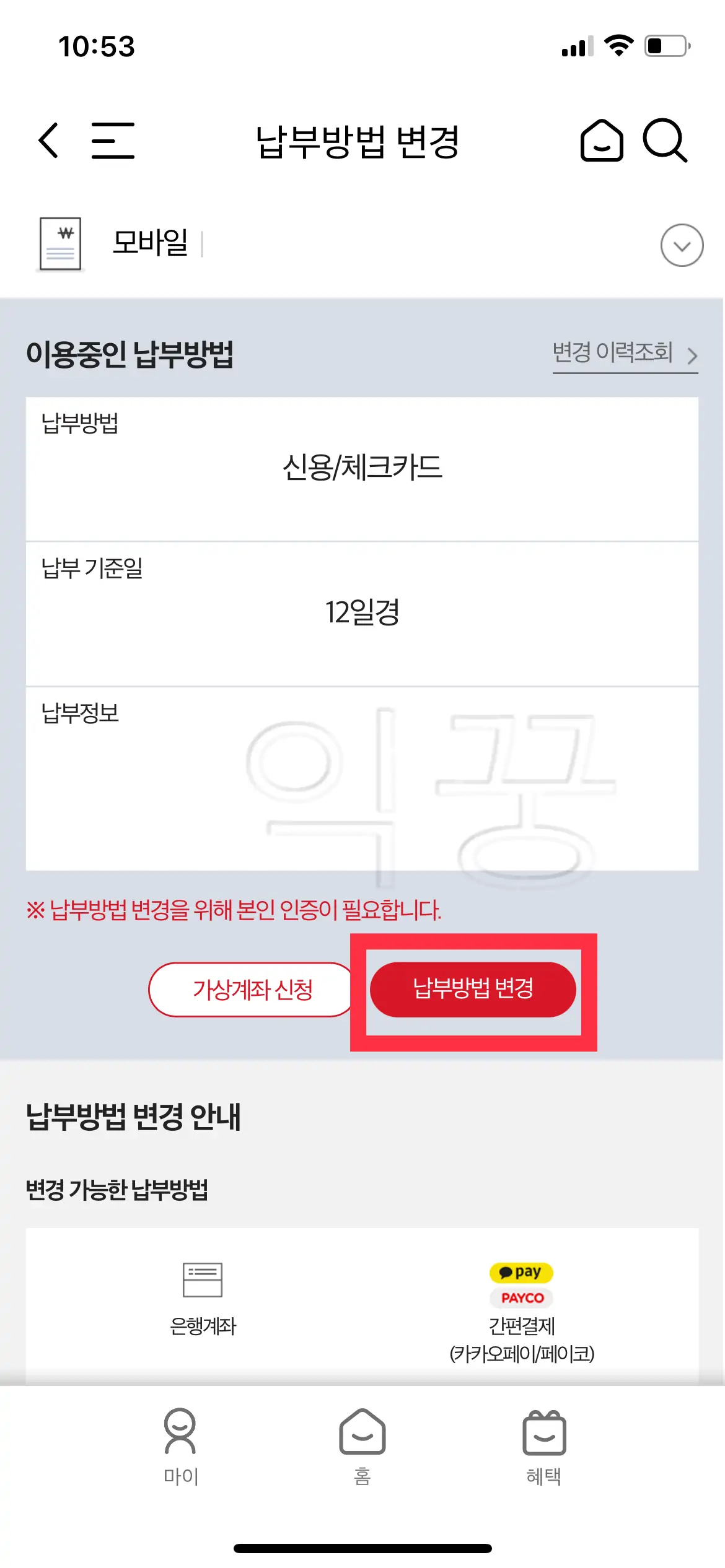 확인 후 우측 사진에서 <납부방법 변경>이라고 쓰여있는 빨간색 버튼을 터치해주자.