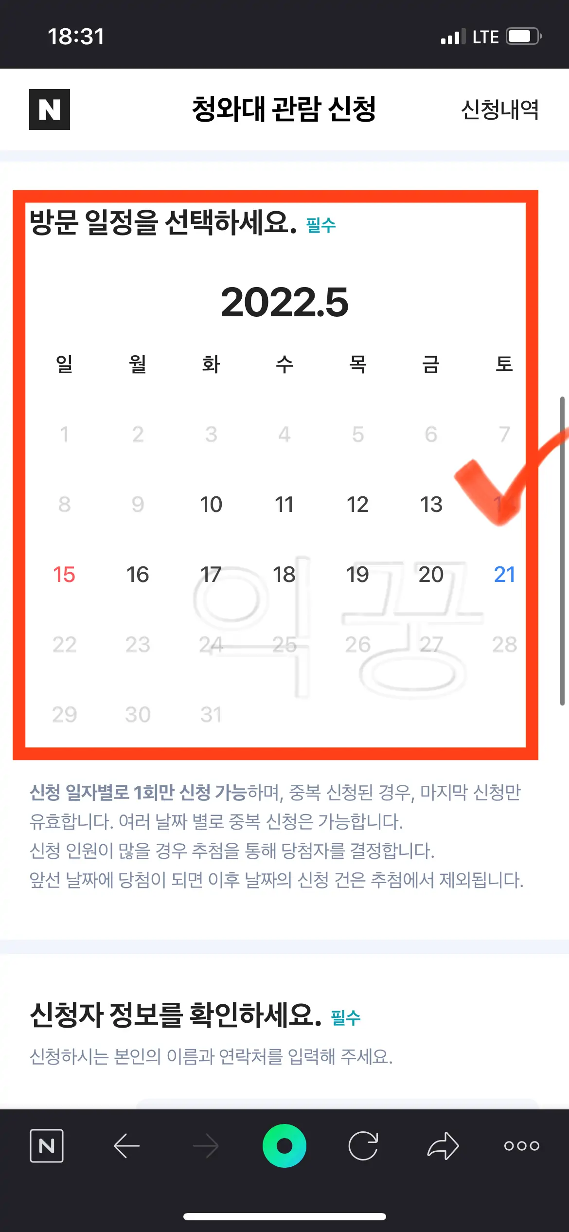 4. 청와대 관람 신청 예약 일정 확인 후 제출