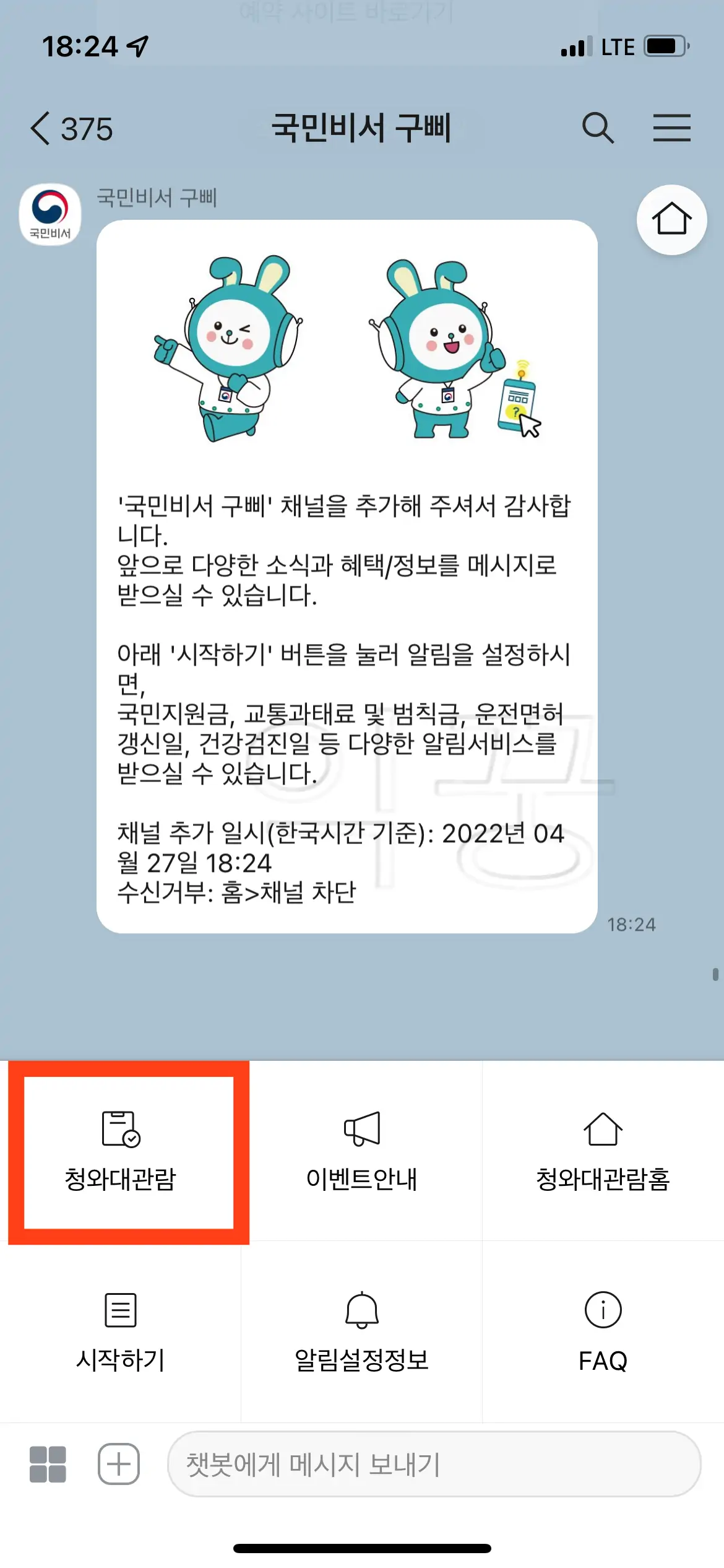<국민 비서 구삐> 채널을 구독하면 바로 아래 사진과 같이 채팅방에 메뉴들이 나오게 된다. 그중에 가장 위에 있는 <청와대 관람> 메뉴를 눌러준다.