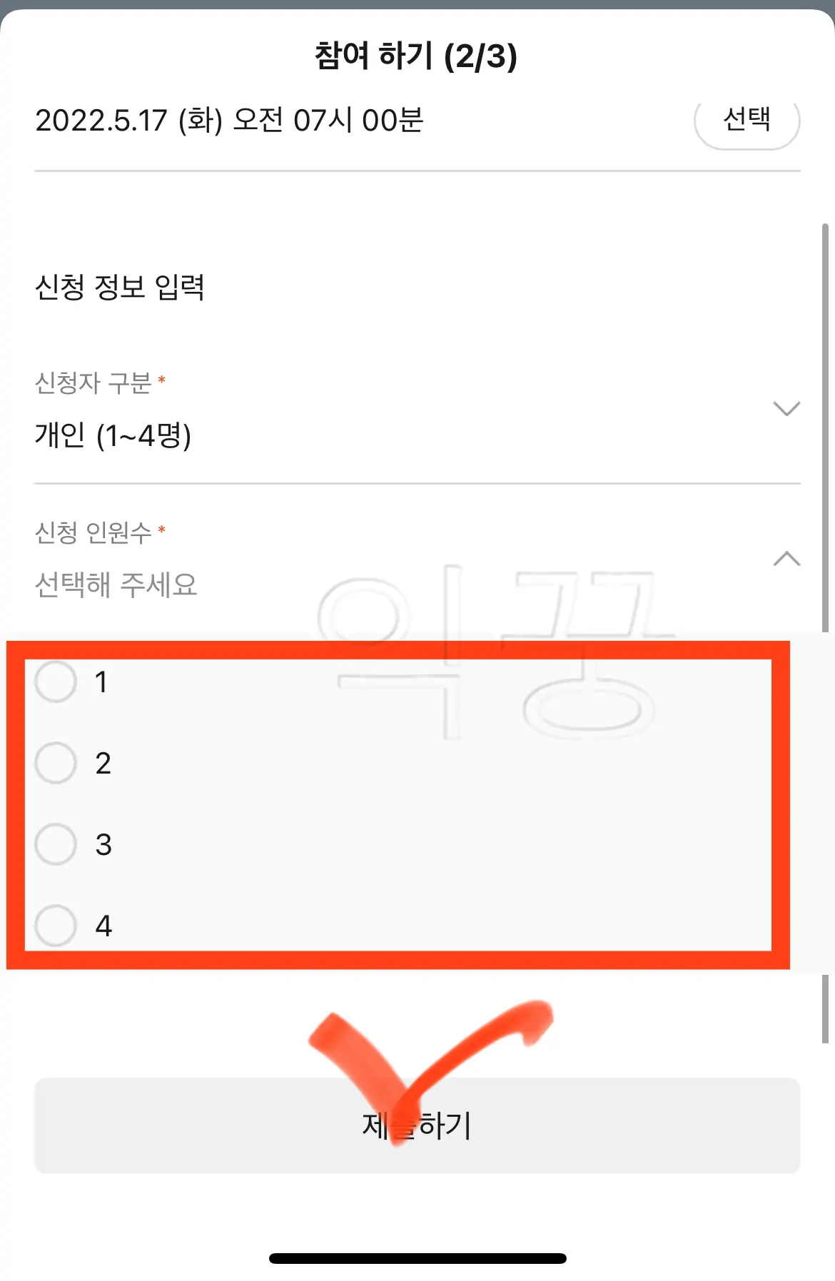이 중에서 본인이 속한 구분을 선택하고 인원수를 골라주면 된다.