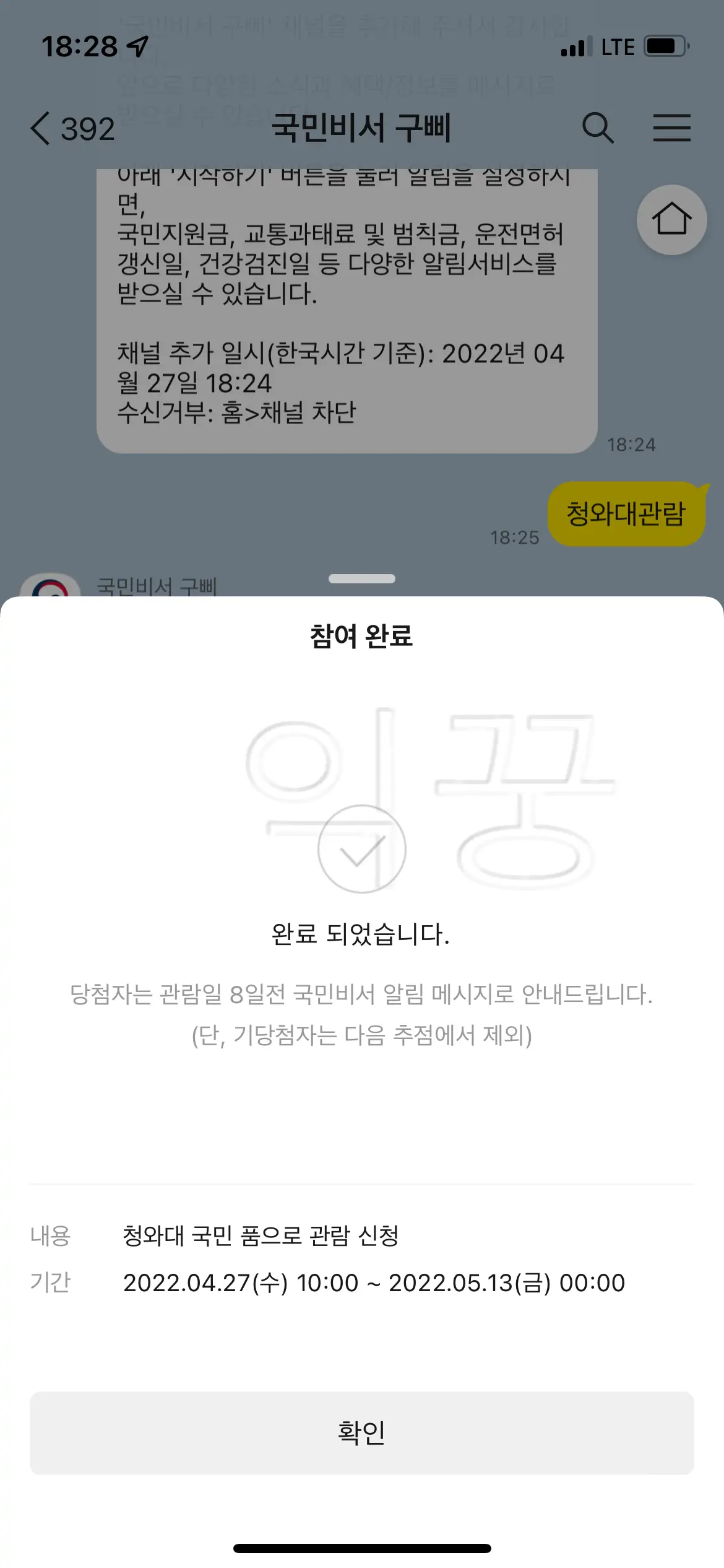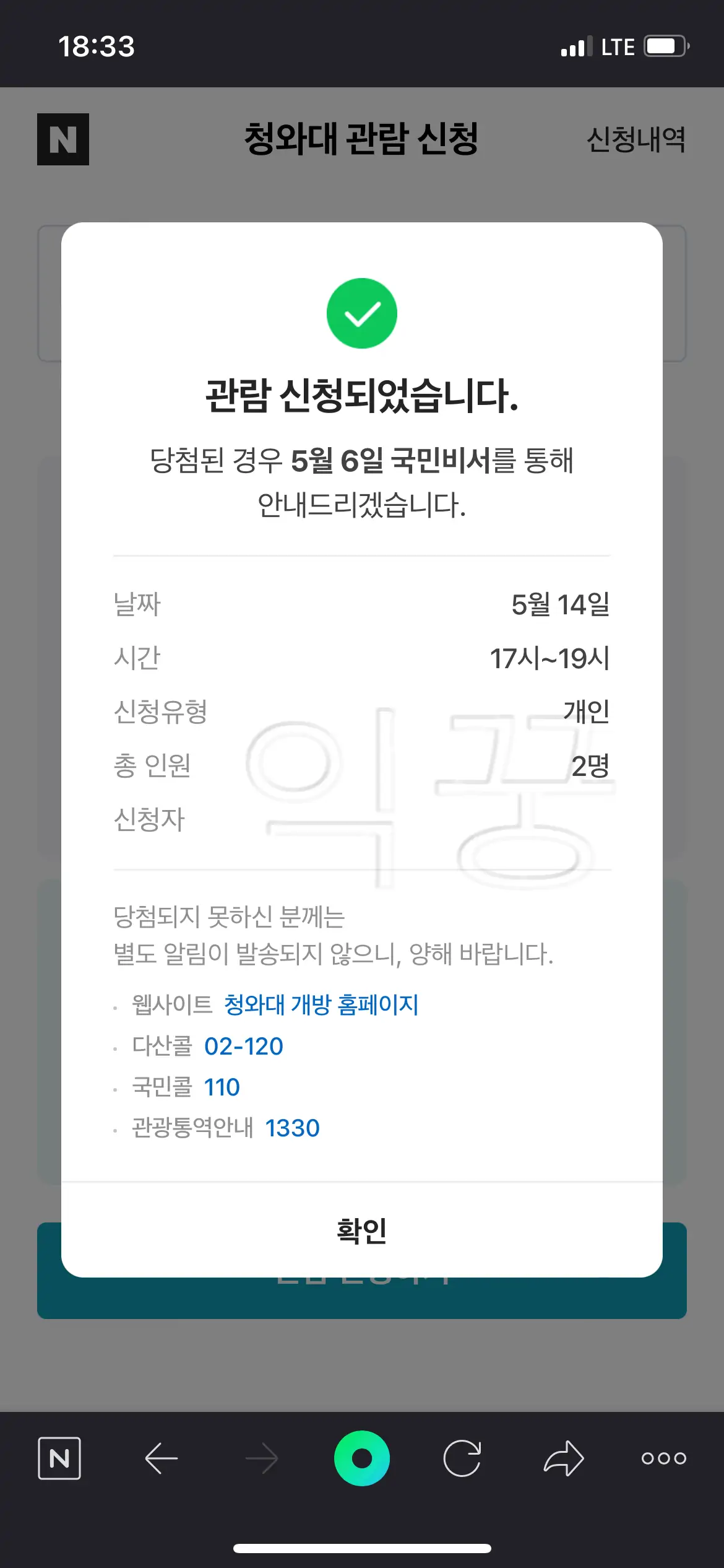 이제 청와대에 입성하기 위한 모든 준비가 마무리되었다. 알림이 오기만을 기다리면서 신청을 제출하고 제대로 되었는지 신청내역을 확인해보도록 하자.