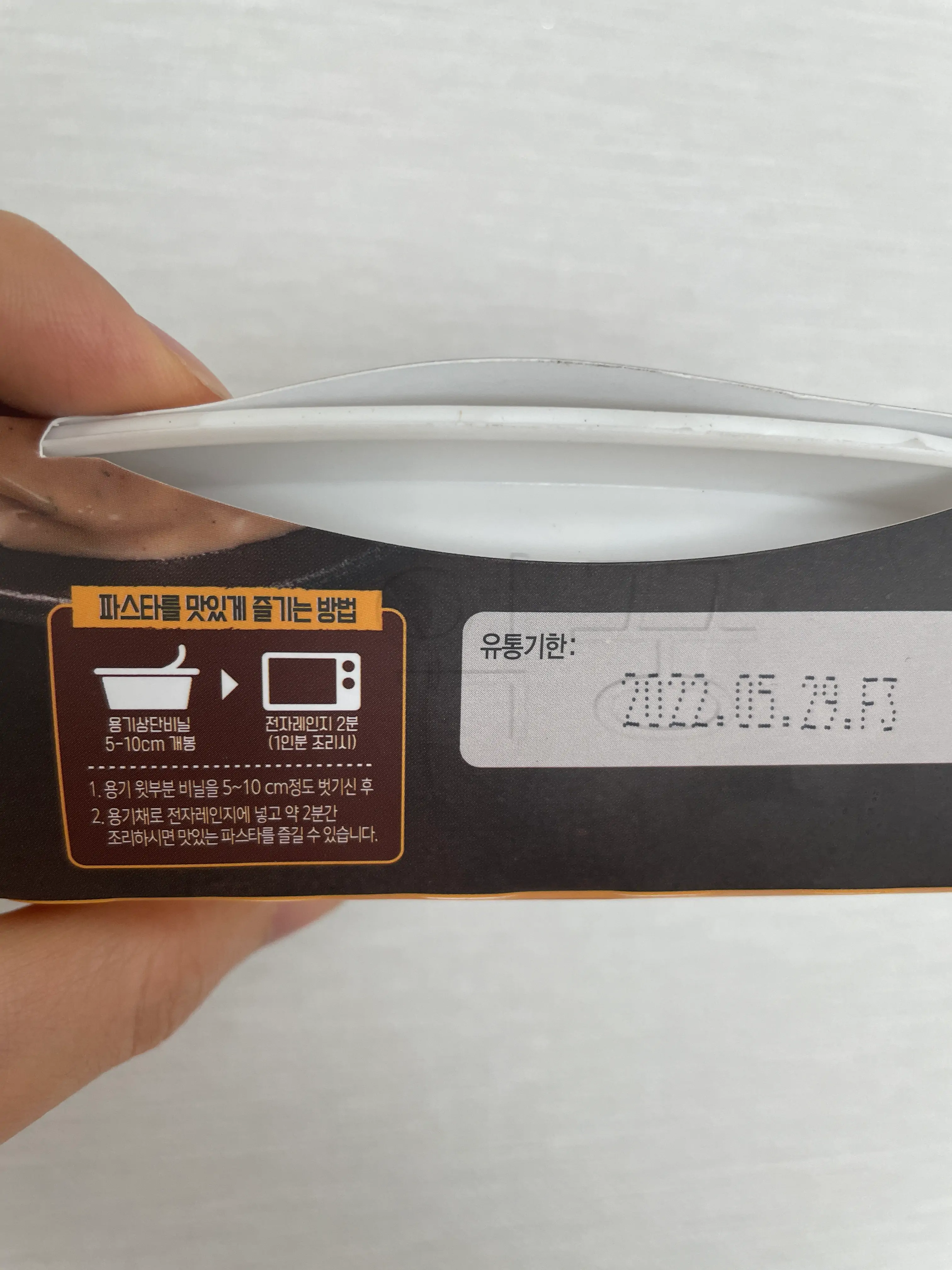 종이를 벗겨낸 이후에 아래 사진에 보이는 하얀색 포장을 조금만 벗겨낸 뒤에 700W 전자레인지 기준으로 2분만 돌려주면 '방금 만들어낸 파스타'와 전혀 다를 바 없는 맛을 낸다.
